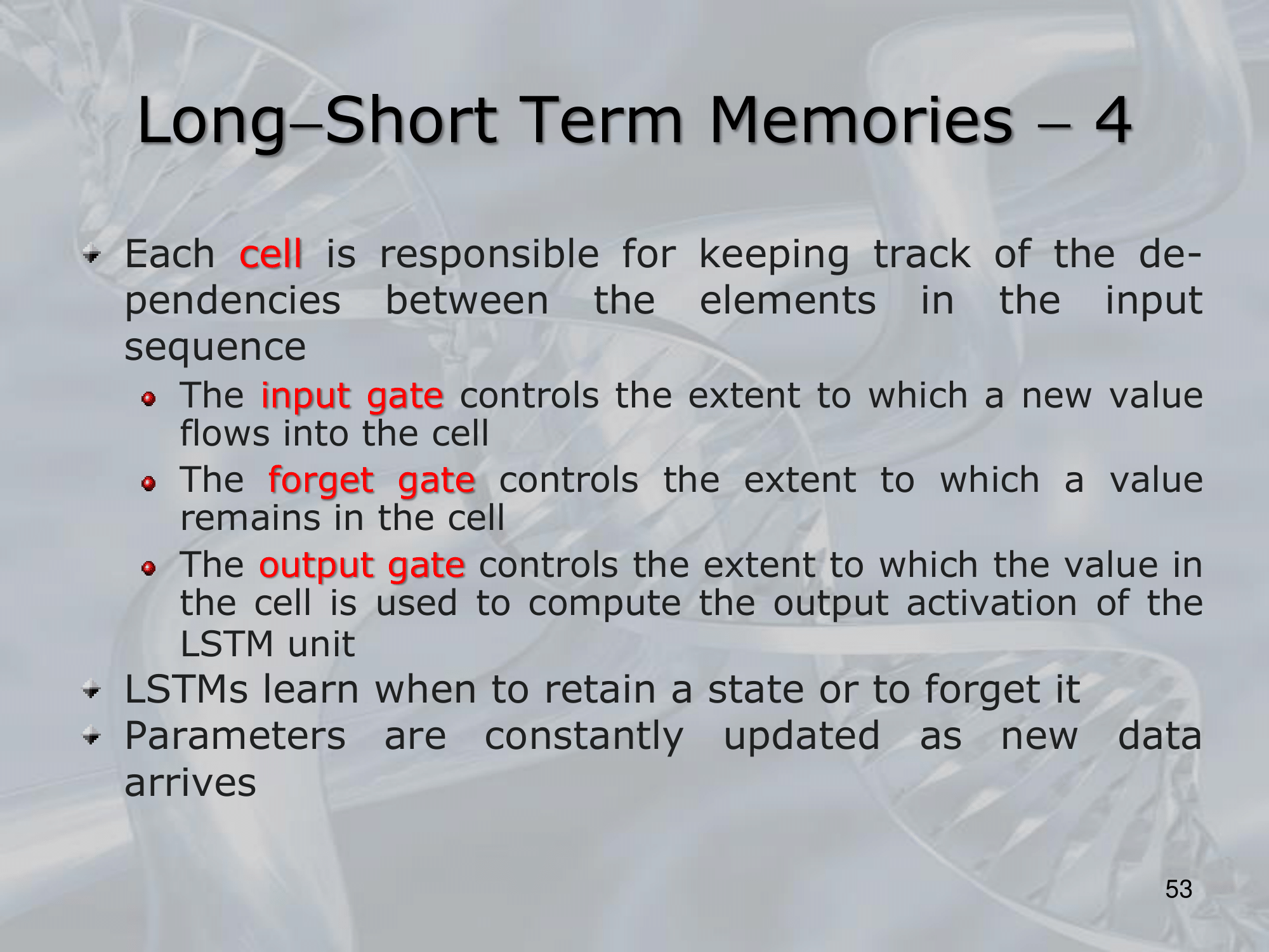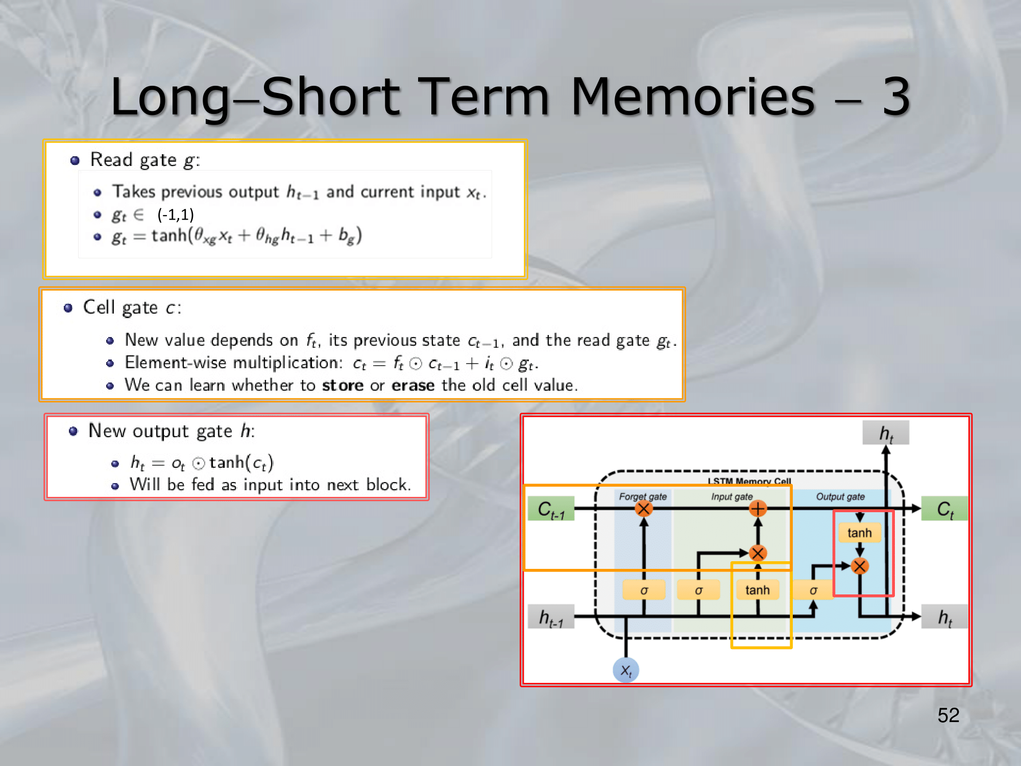 The memory cell is controlled by three gating mechanisms: the input gate, the forget gate, and the output gate.