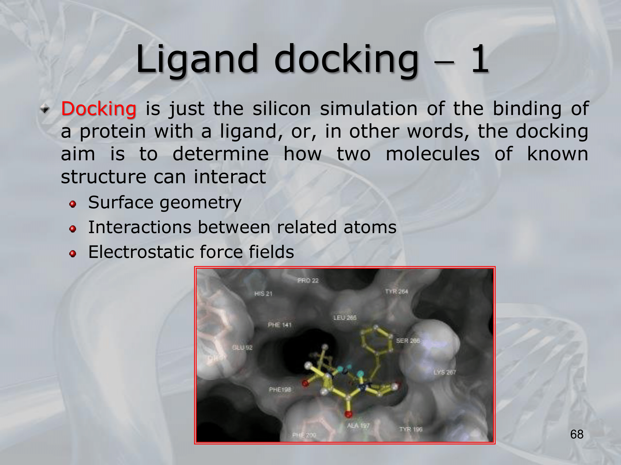 - Overall, ligand docking is an important tool in drug discovery and molecular biology, as it can help identify potential drug candidates, provide insights into the molecular mechanisms of biological processes, and guide experimental design.