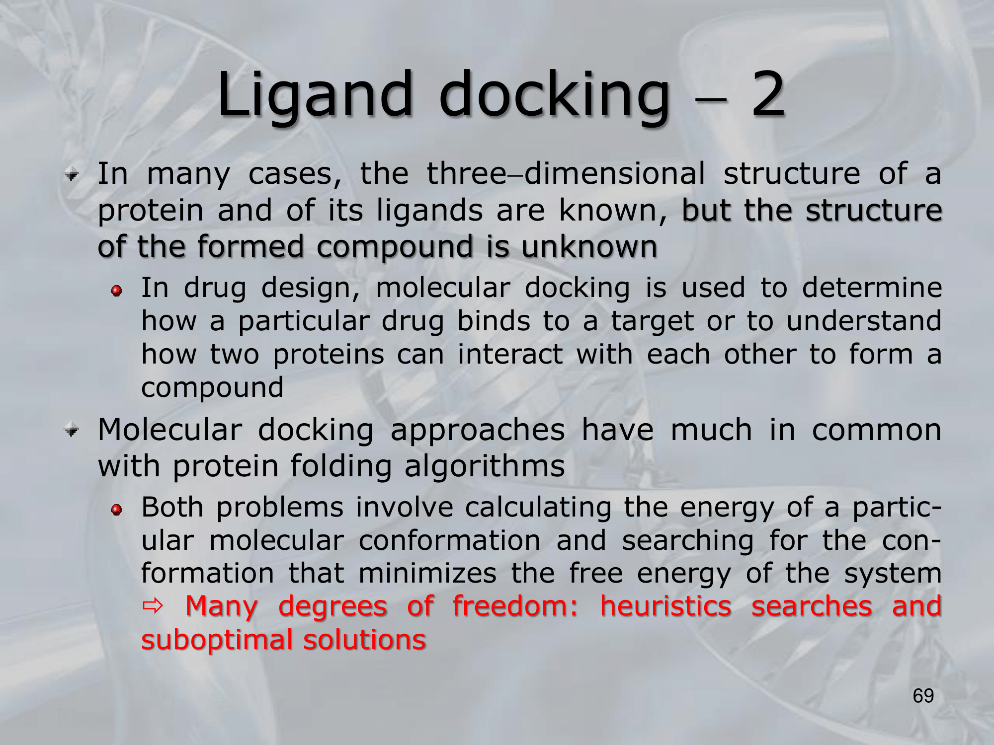 IMPORTANTE In many cases the three dimensional structure a protein and of its ligands are known, what we search for using heuristic searches and suboptimal solutions is the final structure (protein + ligand)