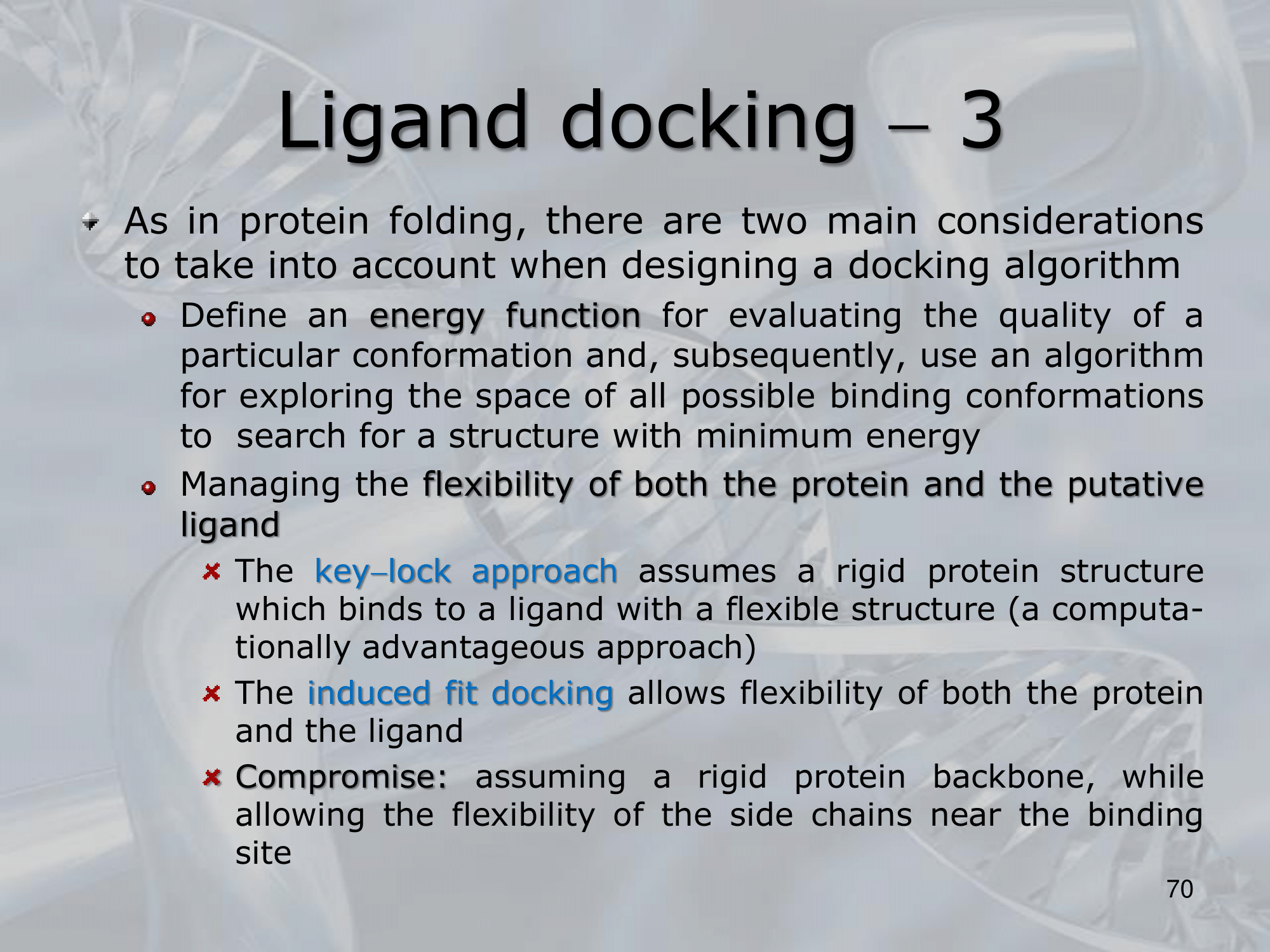 - Managing the flexibility of both the protein and the putative ligand: #IMPORTANTE Key-Lock Approach to Ligand Docking: We assume a rigid protein structure which binds to a ligand with a flexibile structure #IMPORTANTE Induced Fit Docking: Both the protein and the ligand are considered flexible #IMPORTANTE Compromise: Assuming a rigid protein backbone, while allowing the flexibilty of the side chains near the bindign site.