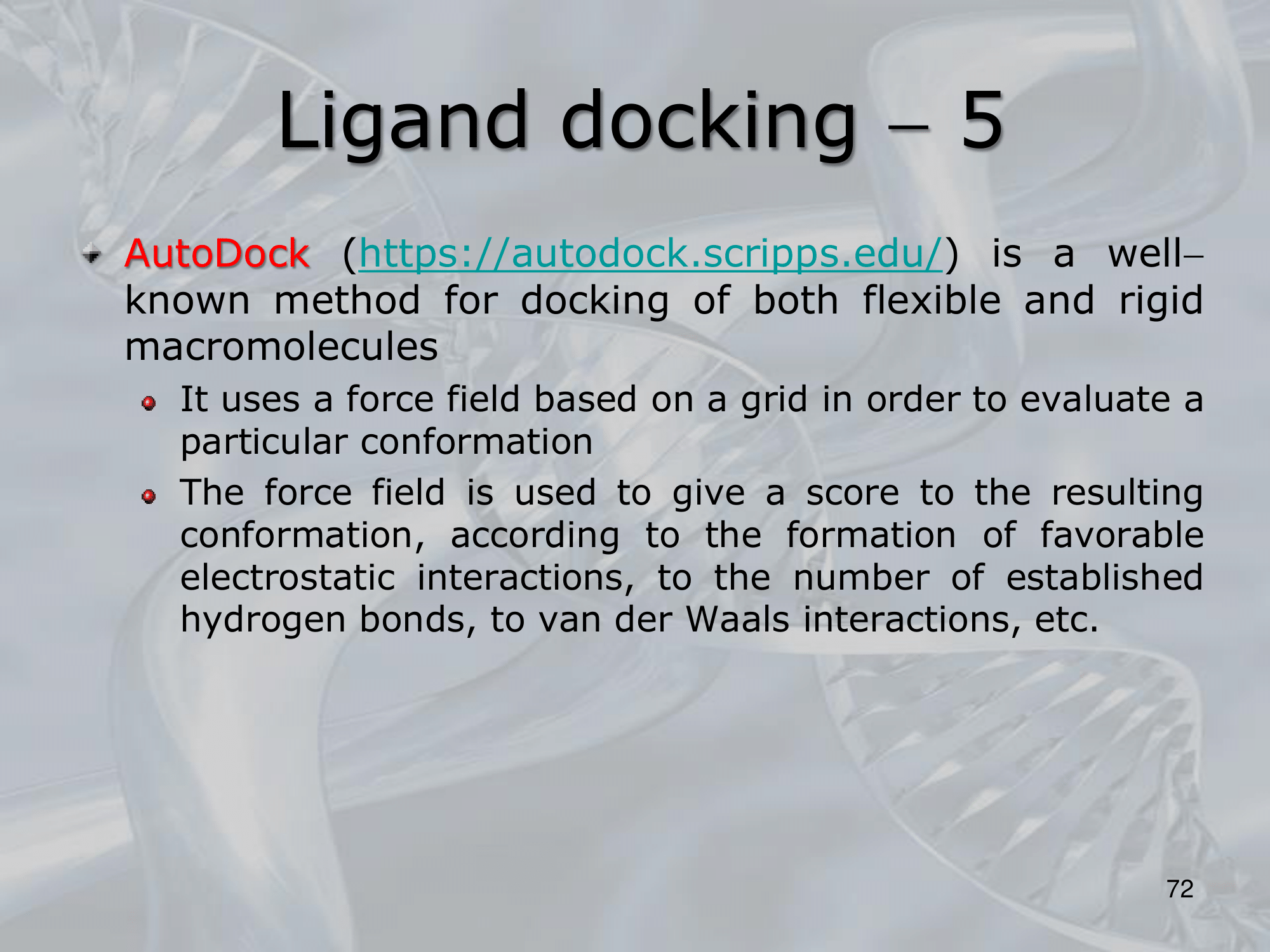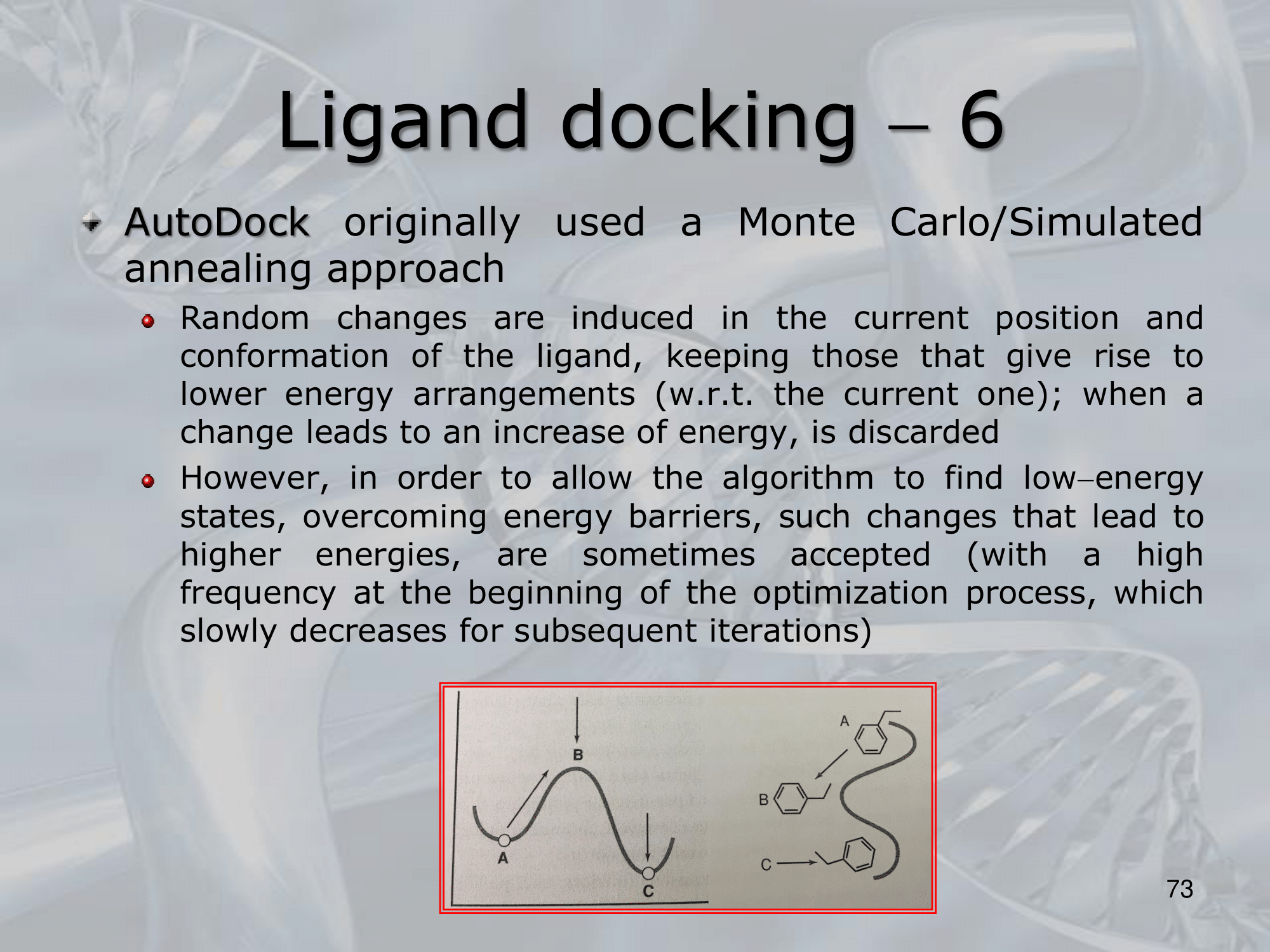IMPORTANTE Auto-Dock method A famous method for both flexible and rigid macromolecules Initially it used the Monte-Carlo Algorithm, allowing some âbad movesâ to find a more exhaustive final soltuion