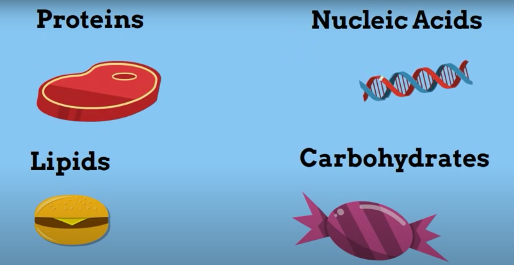 Examples of Carbohydrates are: sugar, starches, cellulose (the cell wall of plants)