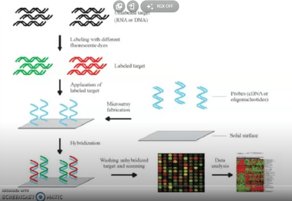 IMPORTANTE cDNA Microarrays: A cDNA microarray uses ESTs (one helix fragment taken from the cDNA library) as probes fixing them in small glass or silicon slides. Then we can mark the cDNA taken from the normal and diseased cell of organism we want to study, and mark them in different fluorescent colors. We put the marked cDNAs in the microarray and watch the resulting colors, to determine the gene expression of the normal tissue/cell and diseased one.