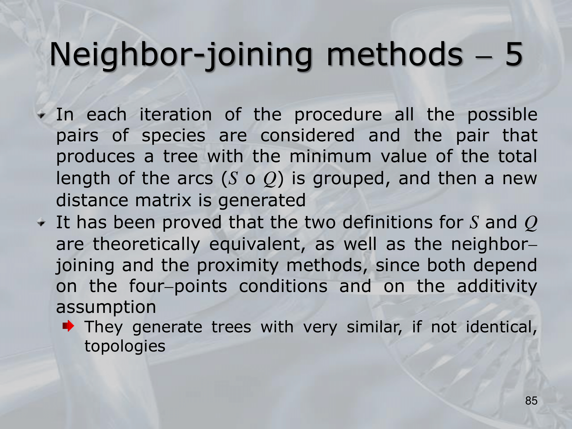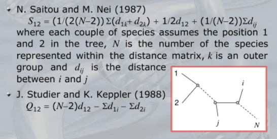 Da questo poi possiamo prendere il migliore rooted tree. Ricordiamo che da un un-rooted tree di foglie, si possono creare fino a rooted trees. Inoltre invece della semplice distanza tra due folgie possiamo applicare una âtrasformazioneâ, usando le formule per o :