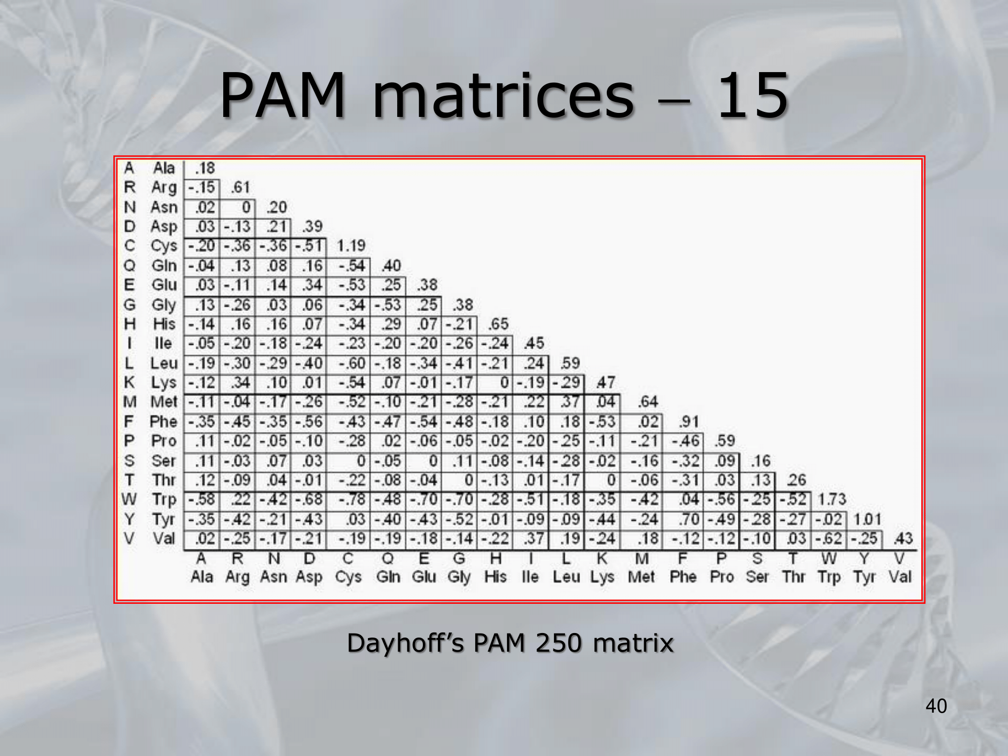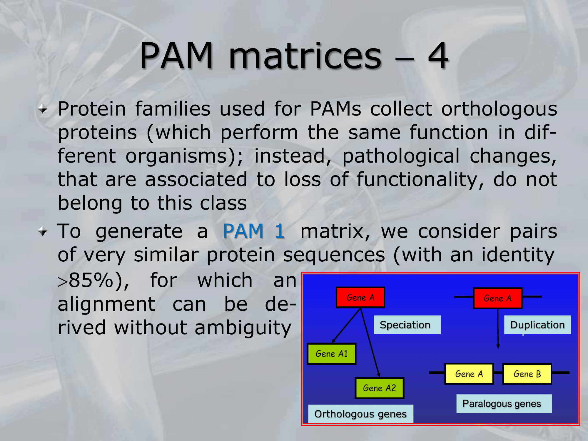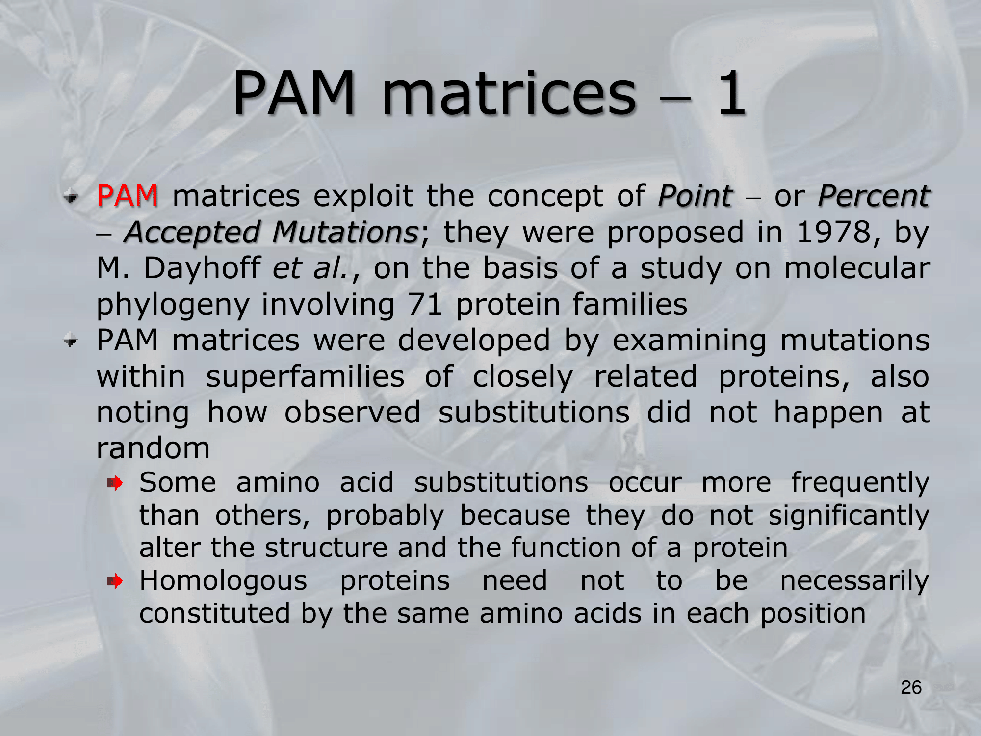 IMPORTANTE PAM Matricies: Point or Percent Accepted Mutation Developed studying closely related proteins, mutations within superfamilies of proteins. It was clear that some amino acids substitutions occur more frequently than others. And homologous proteins do not need to be necessarily constituted by the same amino acids in each positions.