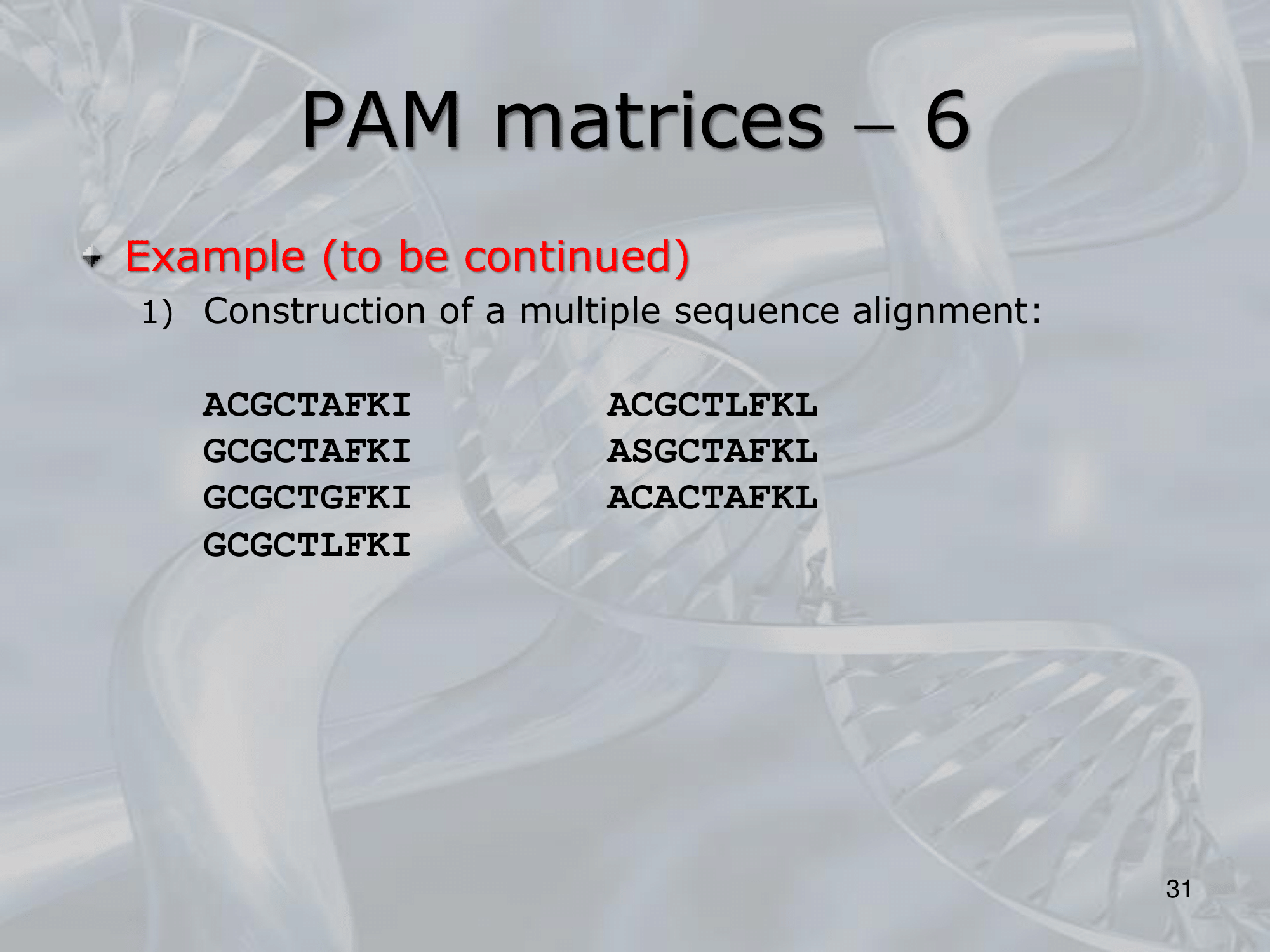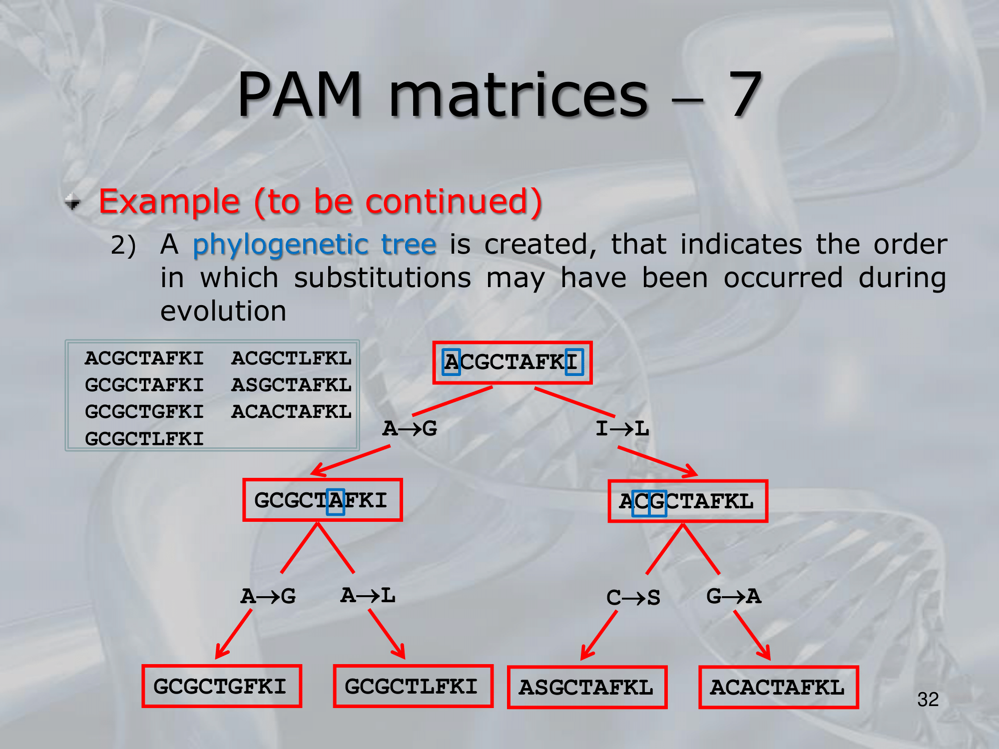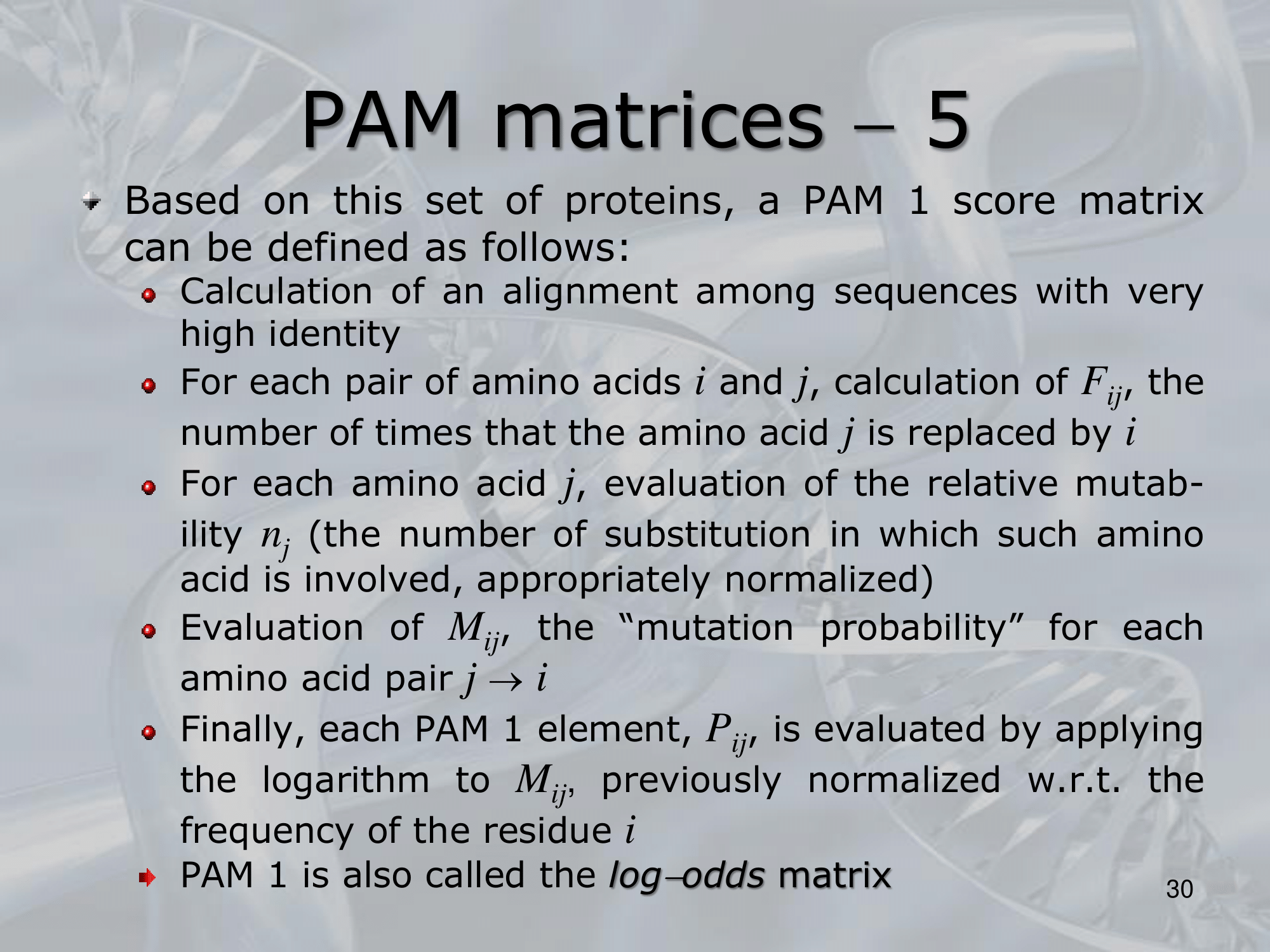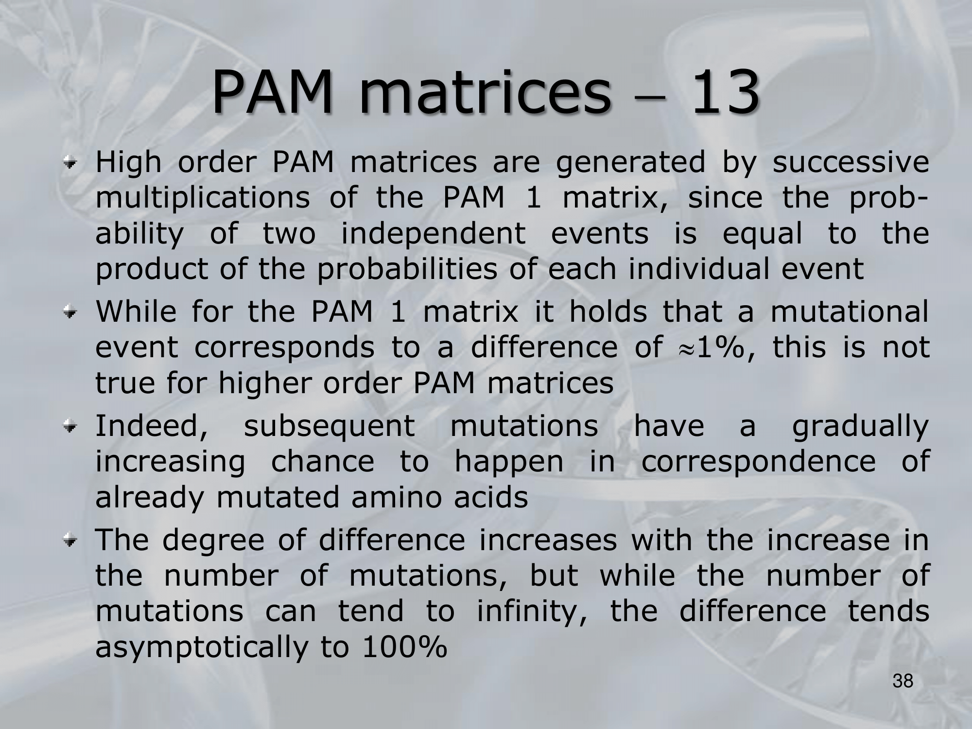 IMPORTANTE PAM Matricies: Point or Percent Accepted Mutation Developed studying closely related proteins, mutations within superfamilies of proteins. It was clear that some amino acids substitutions occur more frequently than others. And homologous proteins do not need to be necessarily constituted by the same amino acids in each positions.