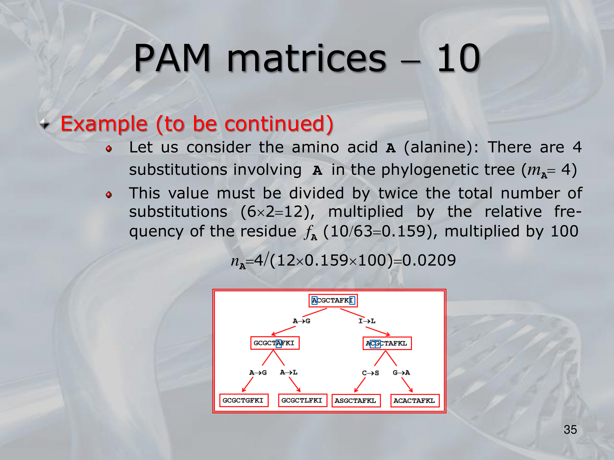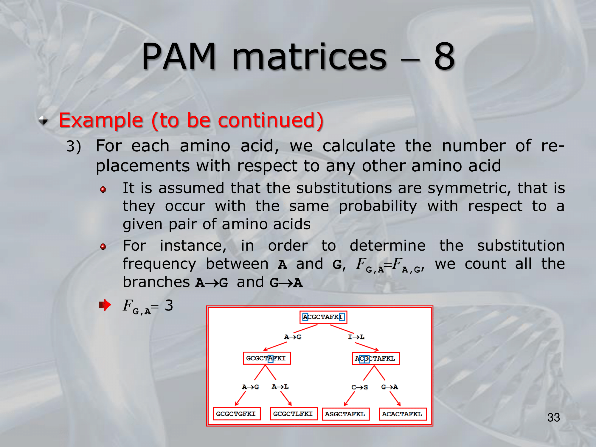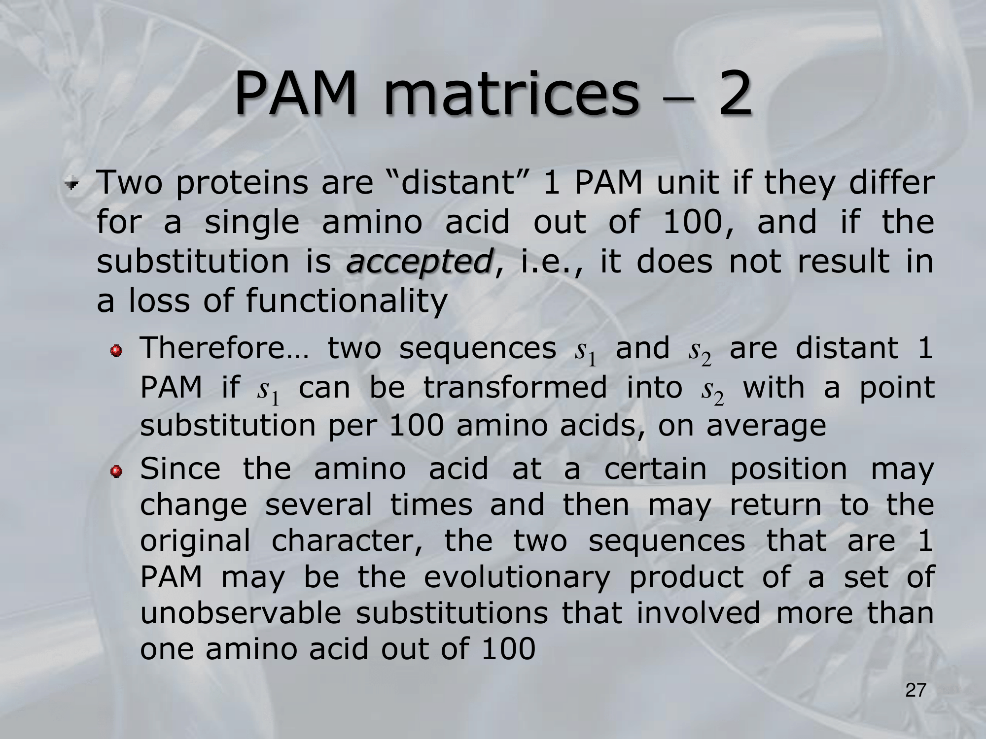 IMPORTANTE PAM Unit: Two proteins are âdistantâ 1 PAM unit if they differ for a single amino acid out of 100, and the substitution is accepted (does not result in a loss of functionality).
