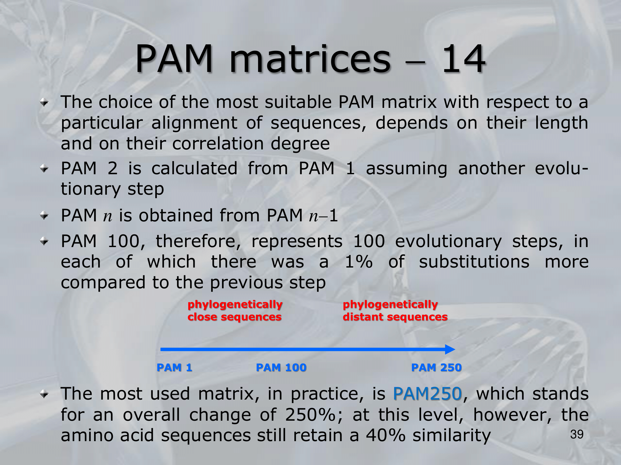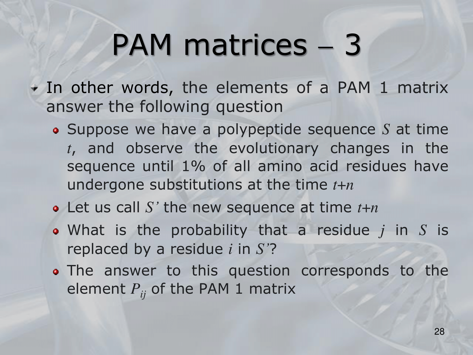 They were originally developed by Margaret Dayhoff and her colleagues in the 1970s, based on empirical observations of the frequency of amino acid substitutions in related protein sequences. - The PAM matrix provides a way to score alignments between two sequences based on the likelihood of each amino acid substitution occurring, given the frequency of observed substitutions between related sequences.
