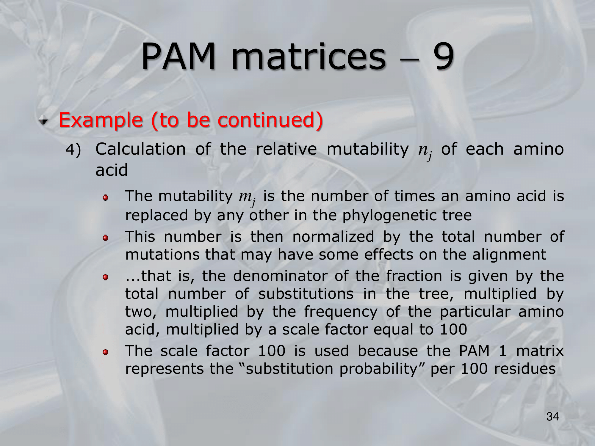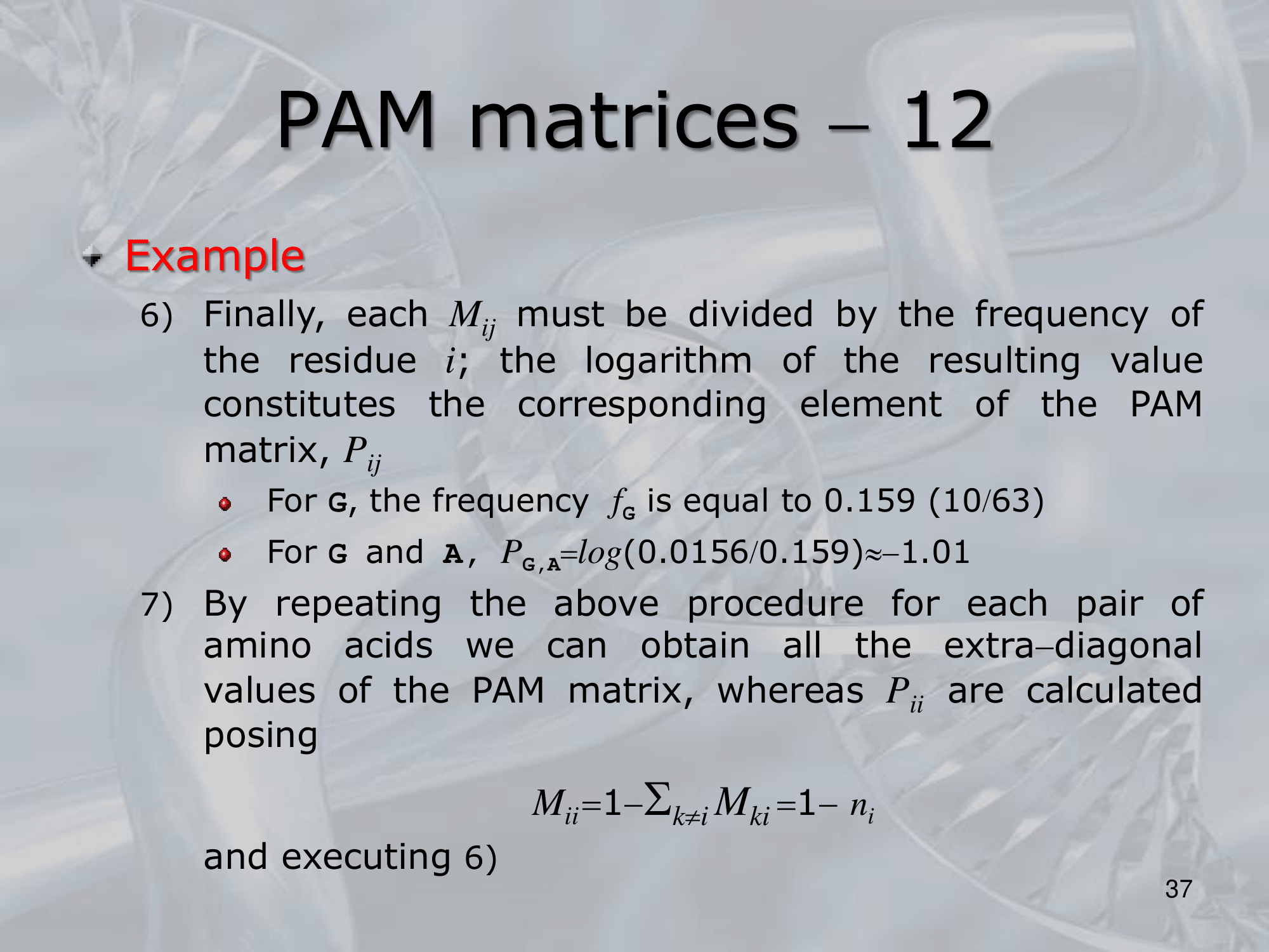 IMPORTANTE PAM n Matrix To create the PAM matrix we take the and scale it according to the frequency of the residue .