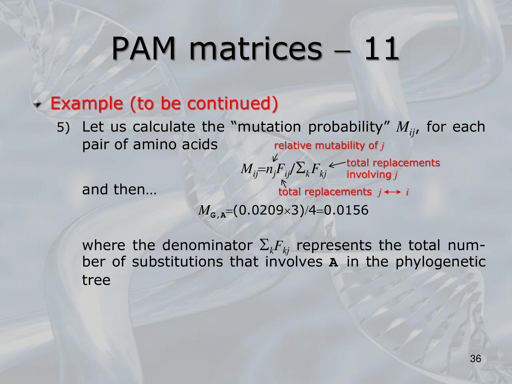 IMPORTANTE Mutation Probability Matrix is the Mutation Probability Matrix and also the base of all PAM Matricies. refers to a matrix where (20 amino acids) where each element of the matrix depends on how many times that substitution has occurred (for example from RâE) The diagonal is the observed number of times that amino acid did not change. ==To create the matrix we multiply by itself times==.
