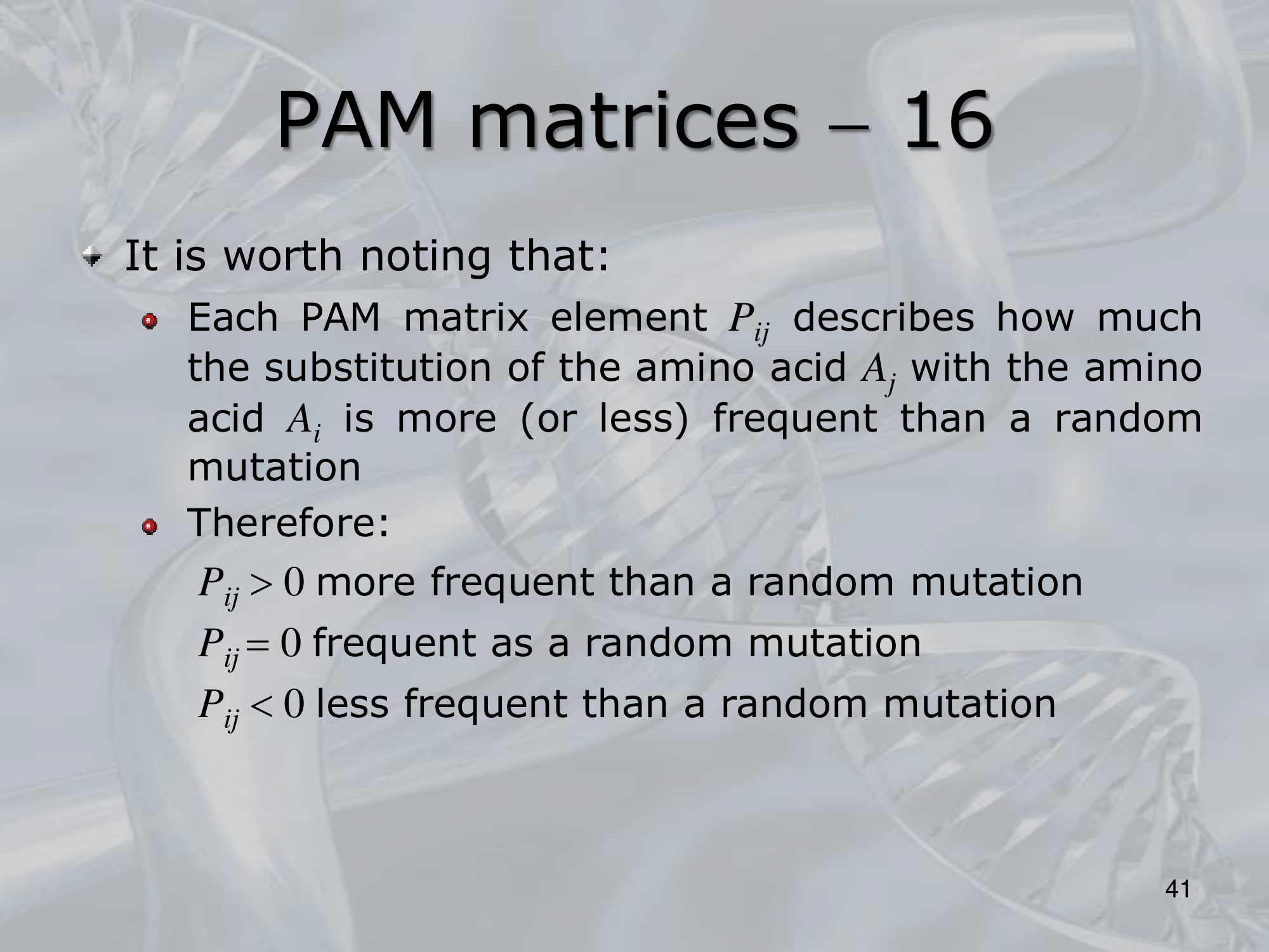 IMPORTANTE Value of the PAM Matrix more frequent than a random mutation frequent as a random mutation less frequent than a random mutation