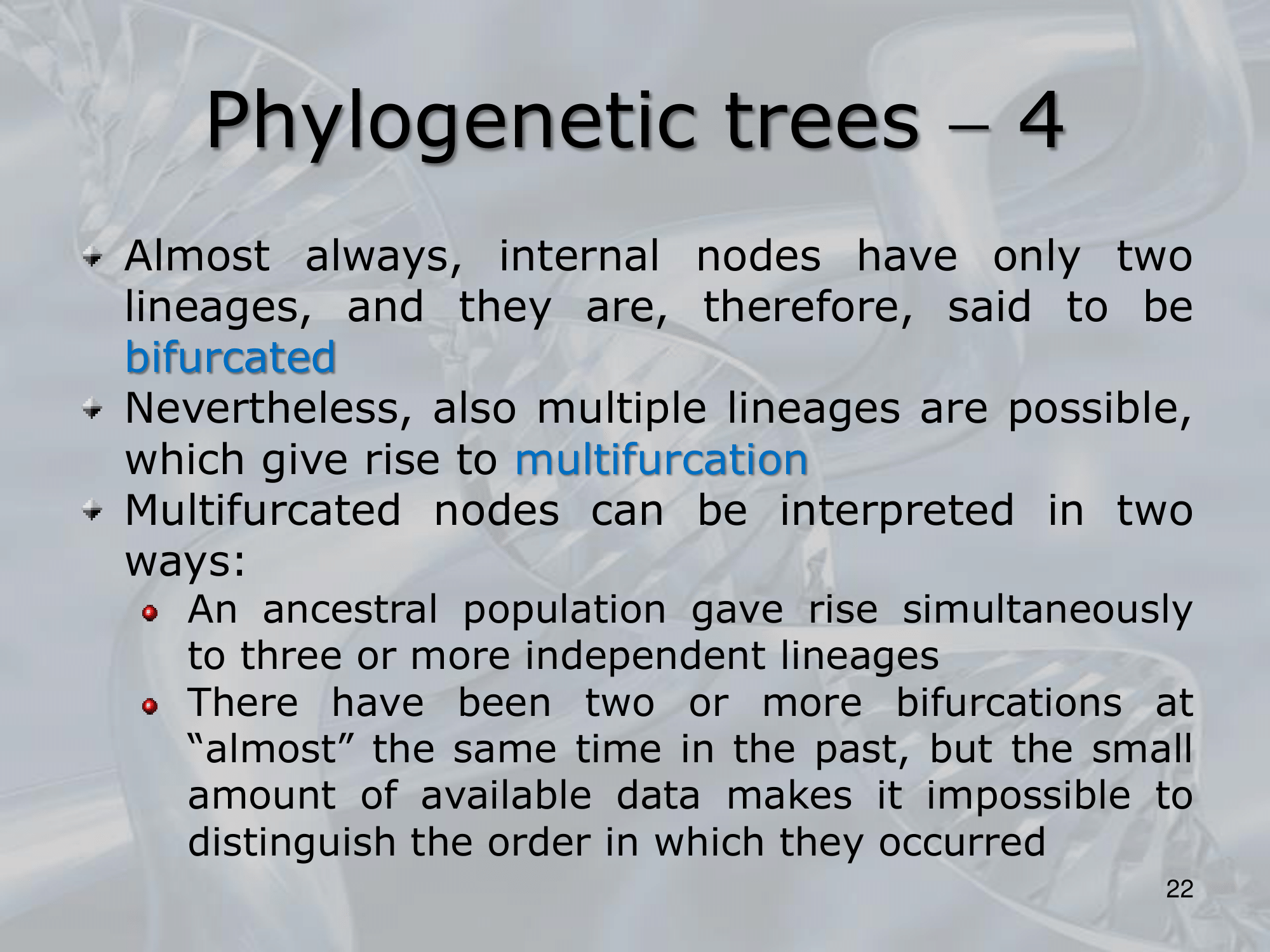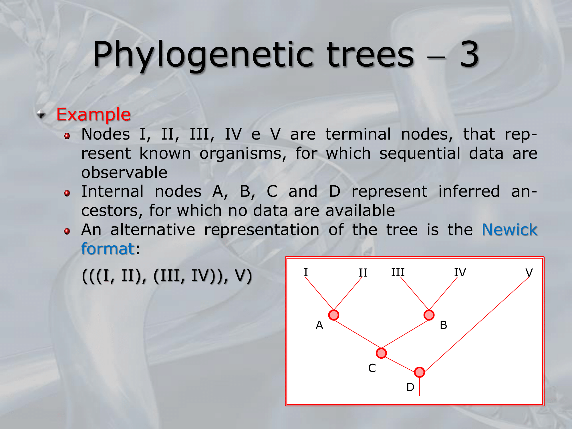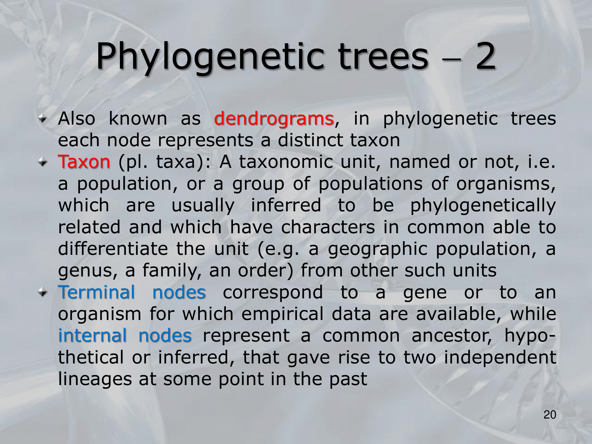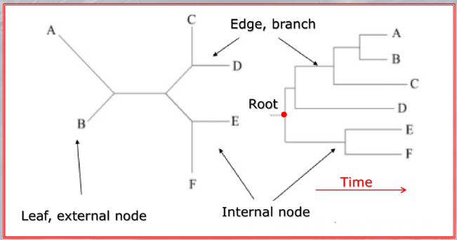 IMPORTANTE Alberi filogenetici, o dendrogrammi sono alberi binari in cui ogni nodo rappresenta unâunitĂ taxonomica, ovvero rappresenta una popolazione o un gruppo di popolazioni di organismi, le foglie degli alberi filogenetici rappresentano geni, o specie attualmente esistenti, o di cui abbiamo dati concreti, i nodi interni invece sono antenati comuni, i cui dati sono solo teorici, basati sui dati dei possibili discendenti (che abbiamo).