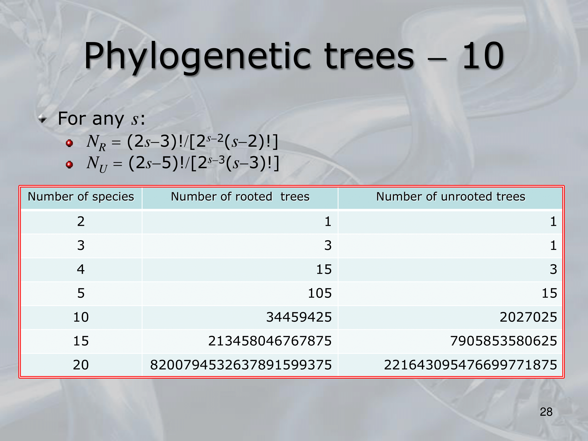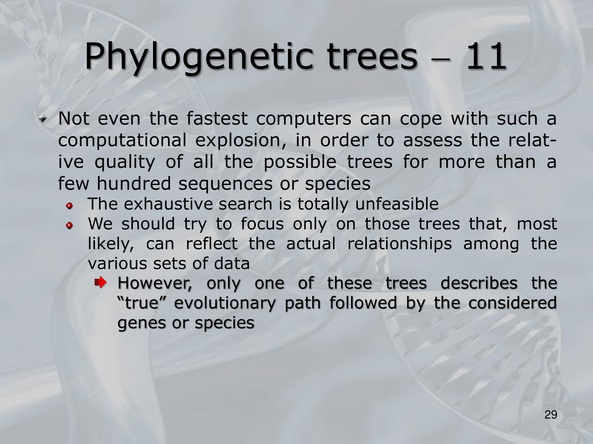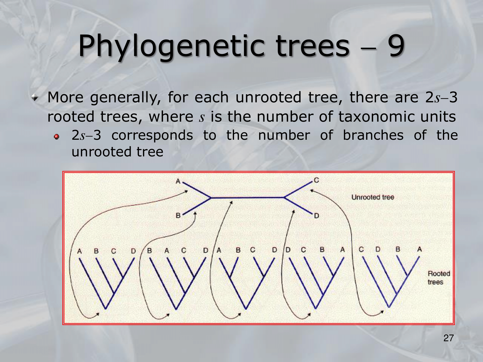 IMPORTANTE Alberi filogenetici, o dendrogrammi sono alberi binari in cui ogni nodo rappresenta unâunitĂ taxonomica, ovvero rappresenta una popolazione o un gruppo di popolazioni di organismi, le foglie degli alberi filogenetici rappresentano geni, o specie attualmente esistenti, o di cui abbiamo dati concreti, i nodi interni invece sono antenati comuni, i cui dati sono solo teorici, basati sui dati dei possibili discendenti (che abbiamo).