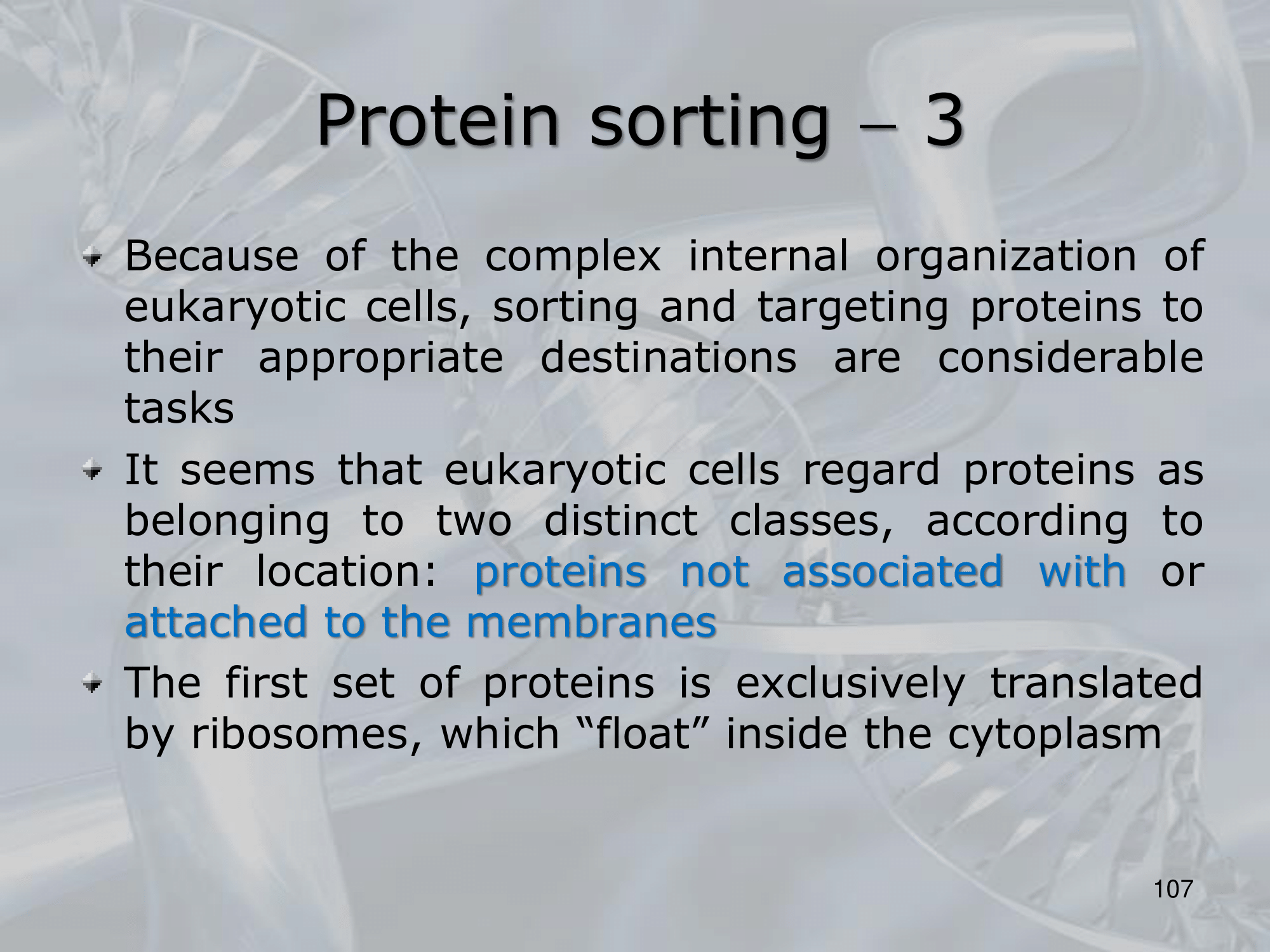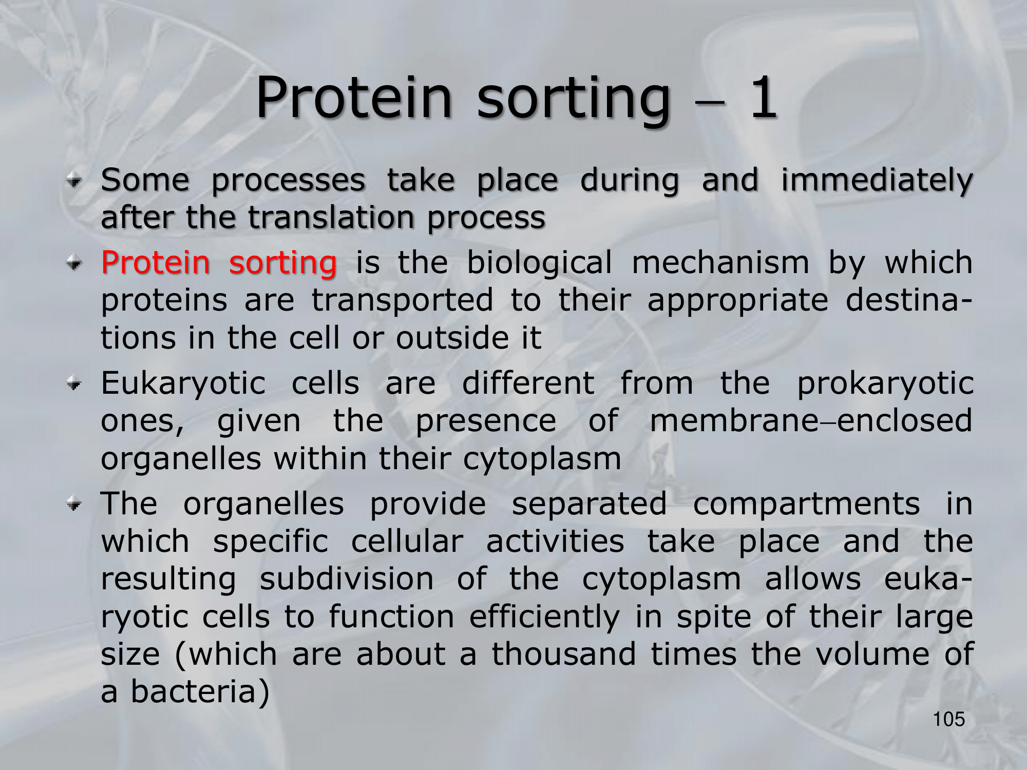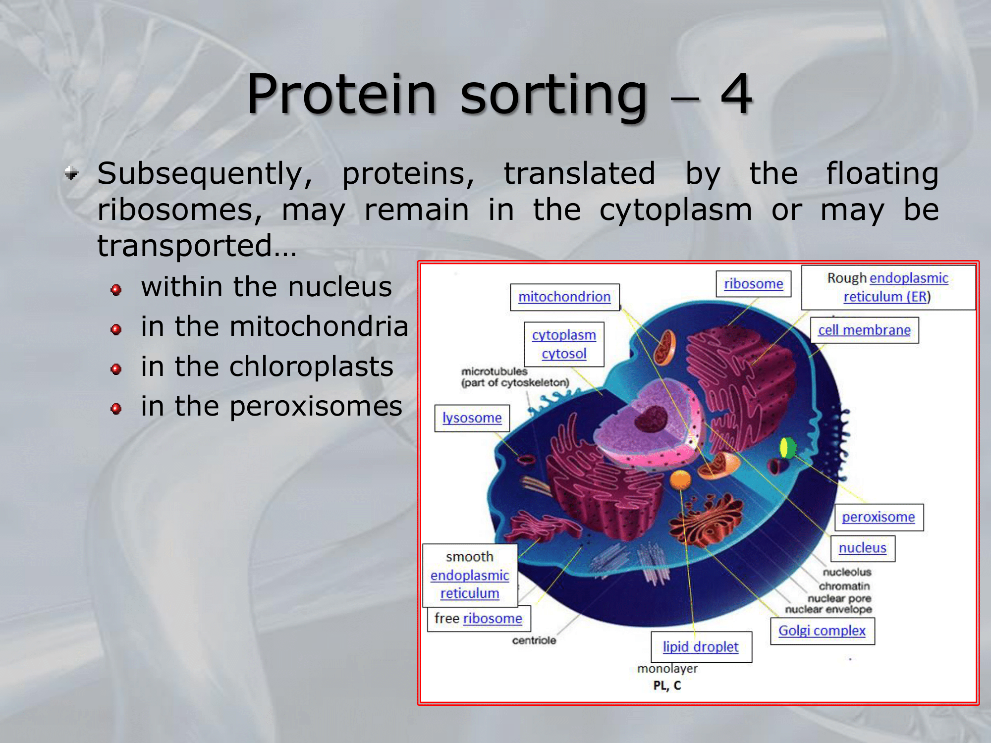 IMPORTANTE Protein Sorting (Protein Transportation Inside the Body): Protein Sorting is the biological mechanism by which proteins are transported to their appropiate destination in the cell. Eukaryotic cell are different than Prokaryiotic ones, given the presence of membrane-enclosed organelles within their cytoplasm.
