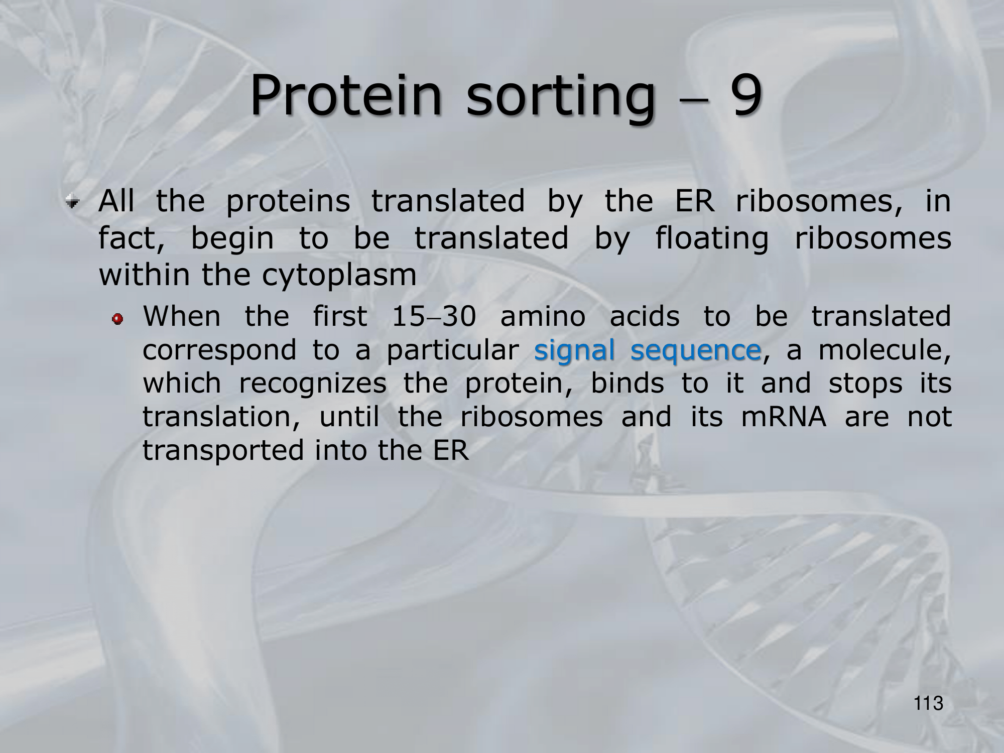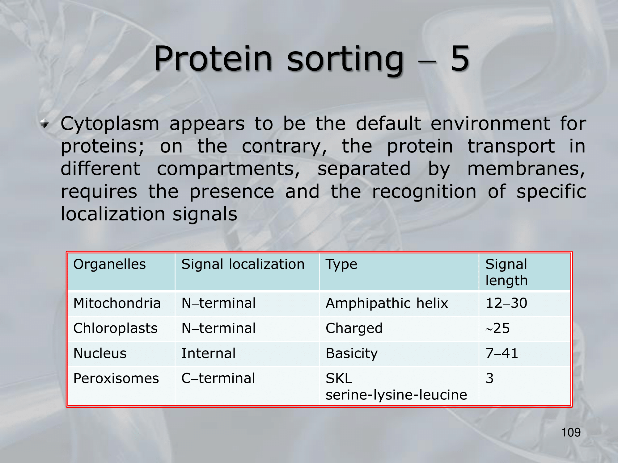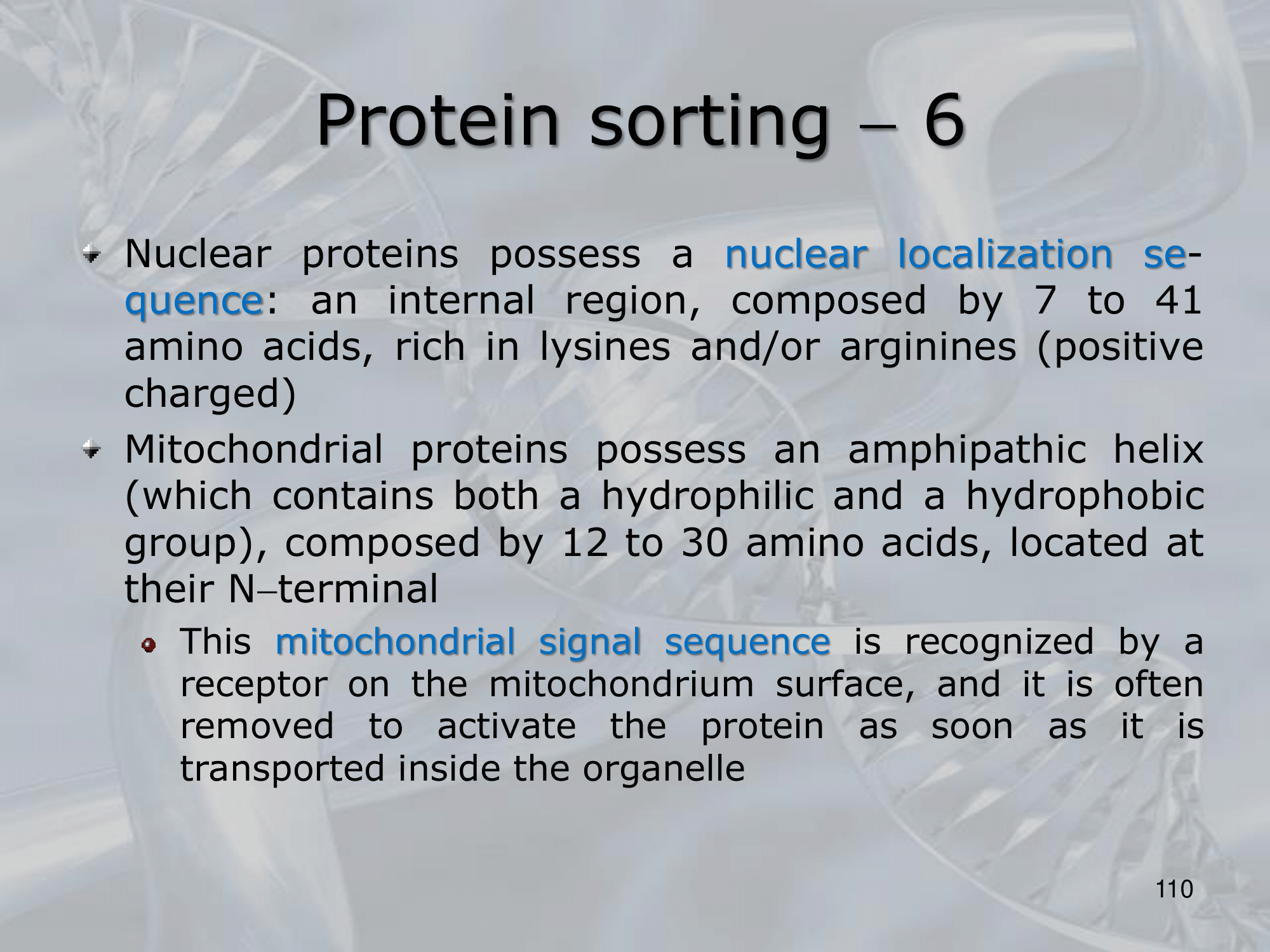 IMPORTANTE Protein Sorting (Protein Transportation Inside the Body): Protein Sorting is the biological mechanism by which proteins are transported to their appropiate destination in the cell. Eukaryotic cell are different than Prokaryiotic ones, given the presence of membrane-enclosed organelles within their cytoplasm.