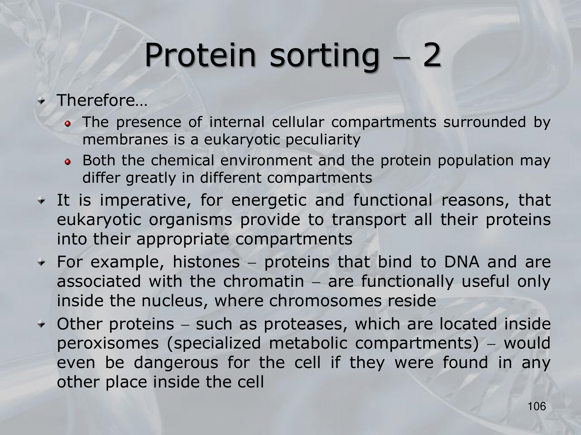 We can think of eukaryotic cells as divided into compartments surrounded by membrane, in this compartments both the chemical envirnment and protein population may differ greatly. ==It is imperative, for energetic and functional reasons that each protein need to be transported into their appropiate compartment== ~Ex.: histones (proteins that bind to DNA) are only useful inside the nucleus where chromosomes reside. ~Ex.: protease, normally located inside peroxisomes, would be dangerous for the cell if they were found in any other place inside the cell. Transporting proteins, is a considerable task, due to the complexity of the interal organization of the cell.