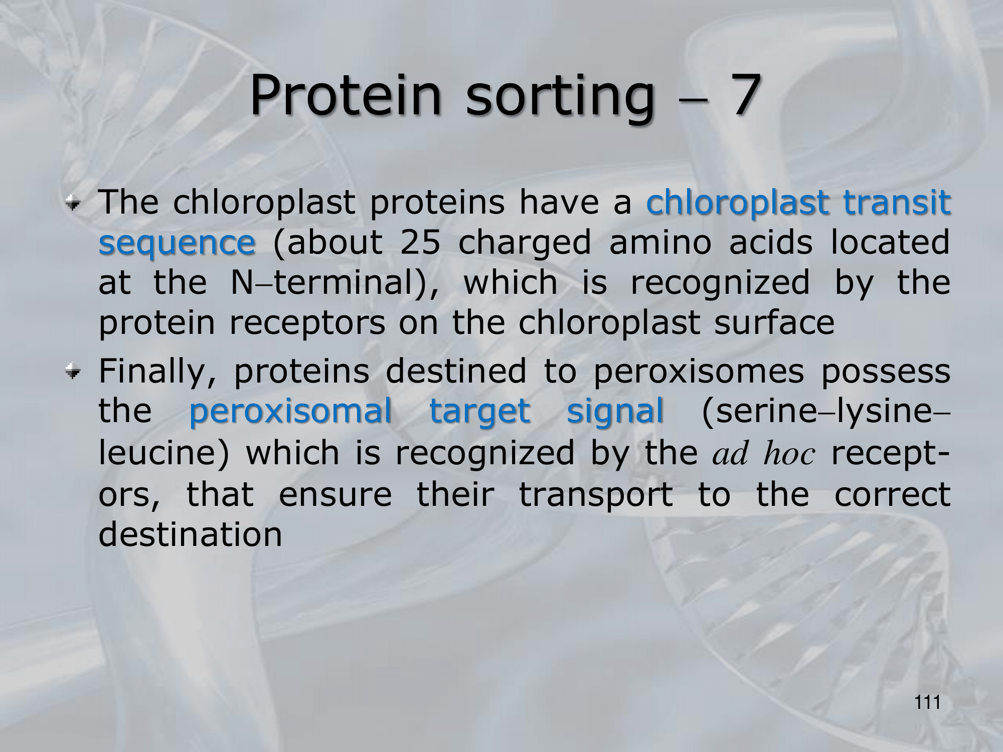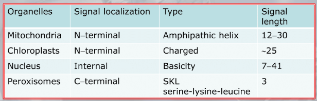 ~Ex.: The cloroplast transit sequence is recognied by the protein receptors on the chloroplast surface. ~Ex.: The peroxisomal target signal (serine-lysine-leucine) is recognized by ad hoc receptors, to ensure the transport of this proteins to the correct destination.