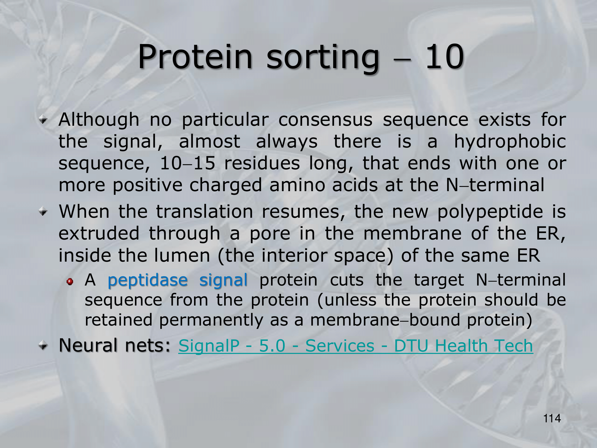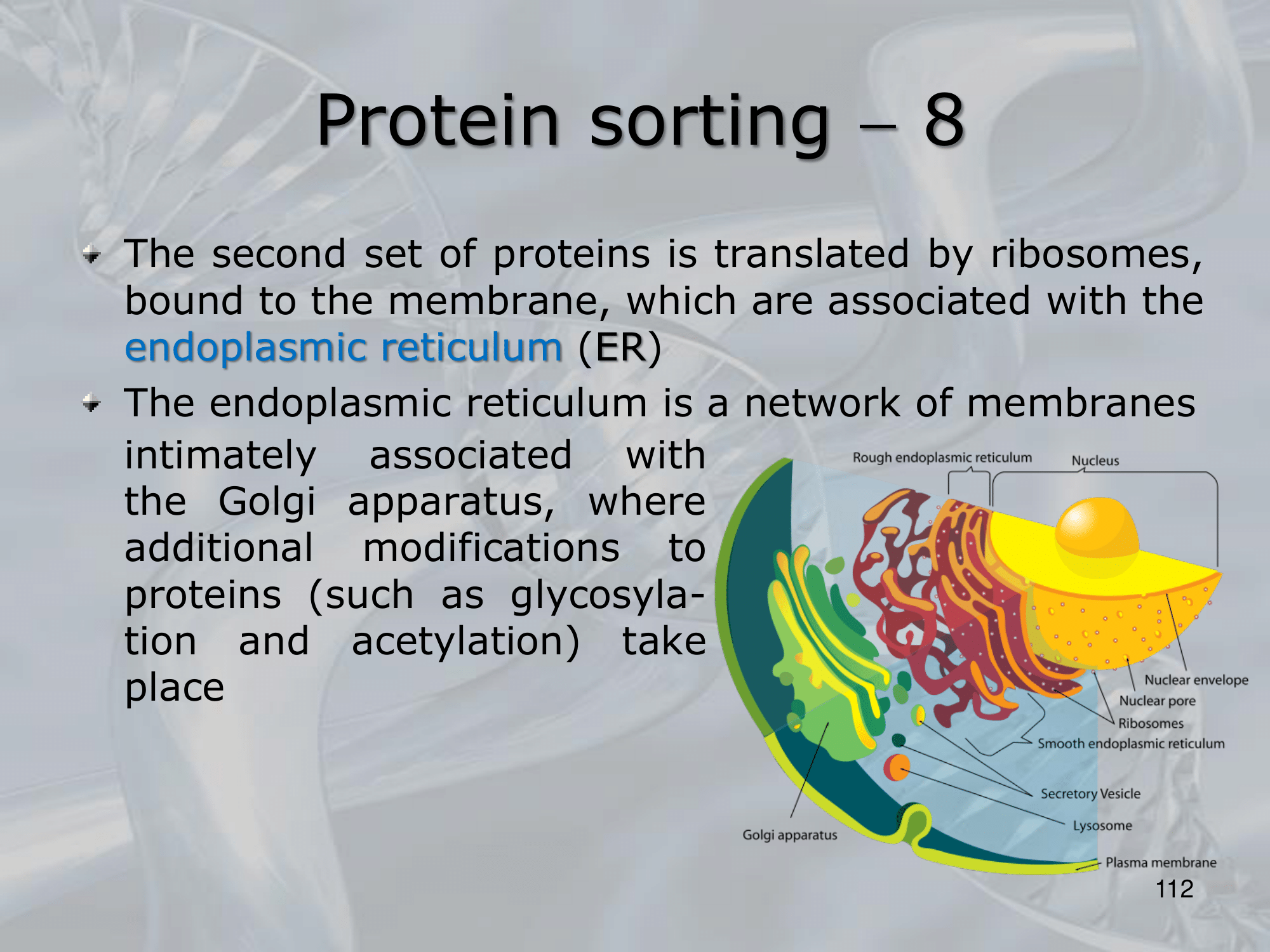 Some examples of targeting signals include the signal peptide, which directs proteins to the endoplasmic reticulum, and the nuclear localization signal, which targets proteins to the nucleus. - Sorting mechanisms include vesicular transport, in which proteins are packaged into vesicles that bud off from one membrane and fuse with another, as well as protein translocation across membranes, in which proteins are directly inserted into or across a membrane by translocation channels or pores.