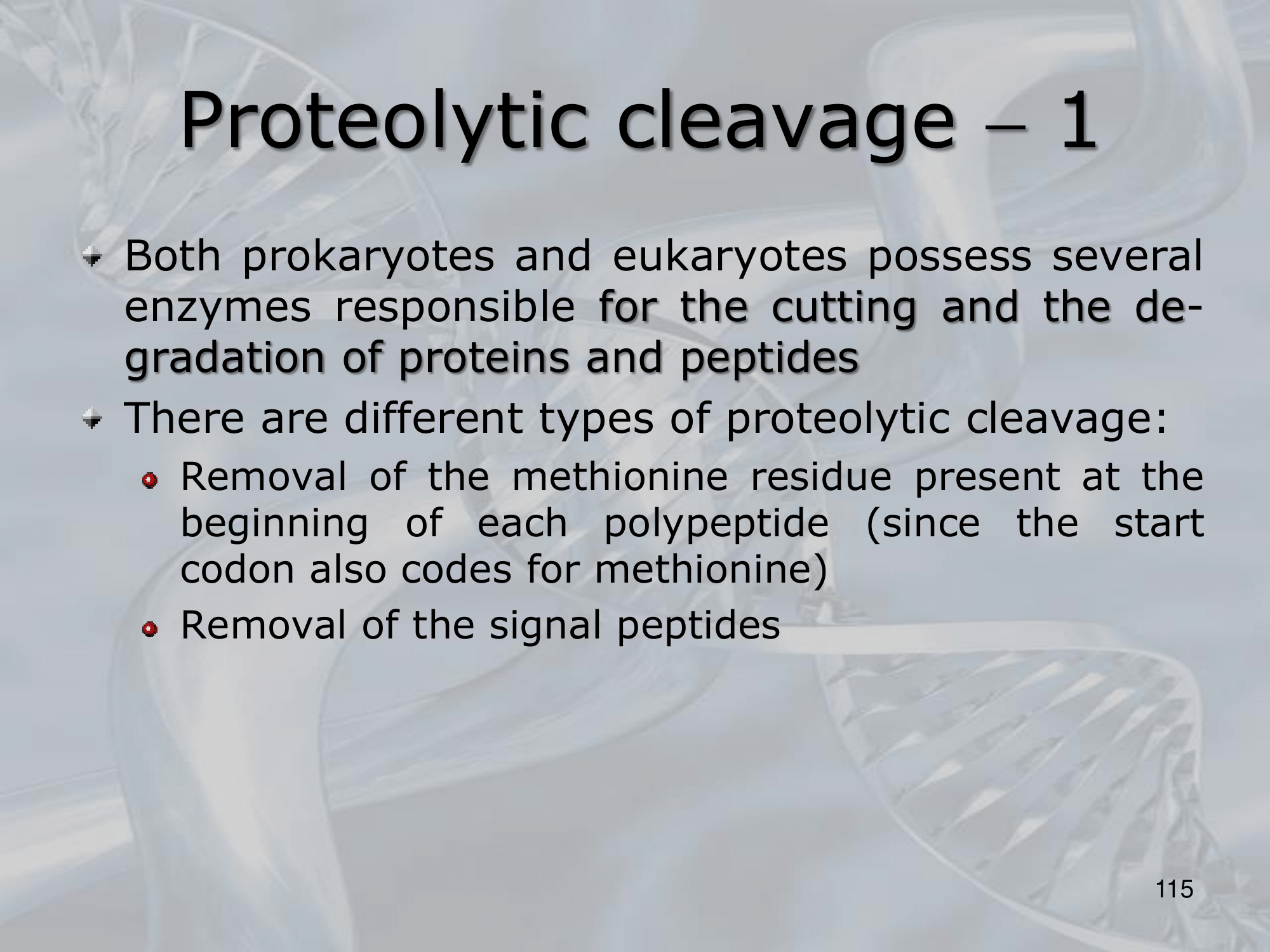 IMPORTANTE Proteolytic Cleavage: Both prokaryotes and eukaryotes posses several enzyme for cutting the proteins and peptides. There are different types of proteolytic cleavage: