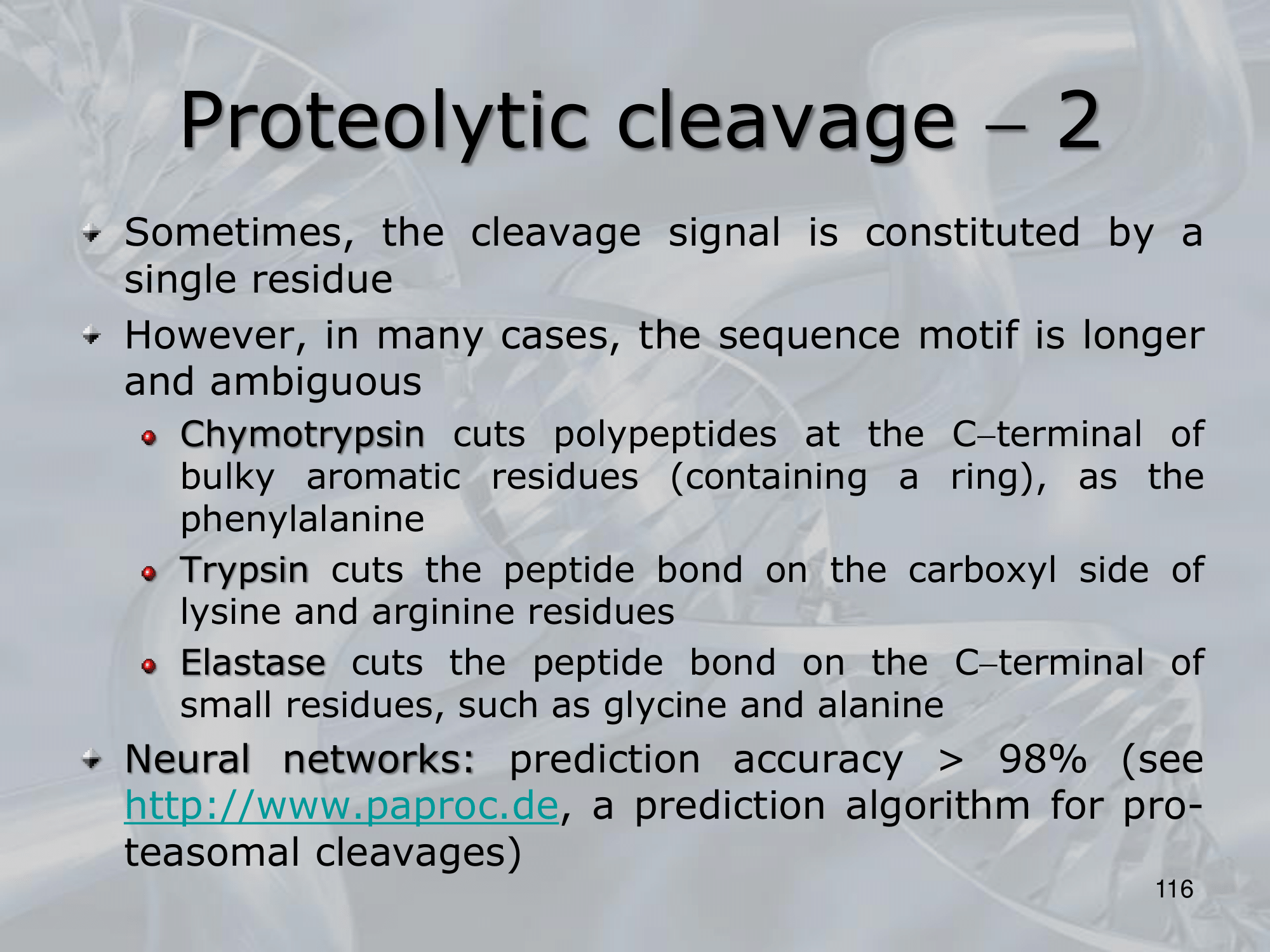 - Elastase cuts the peptide bond on the C-terminal of small residues (~ex.: glycine and alanine)