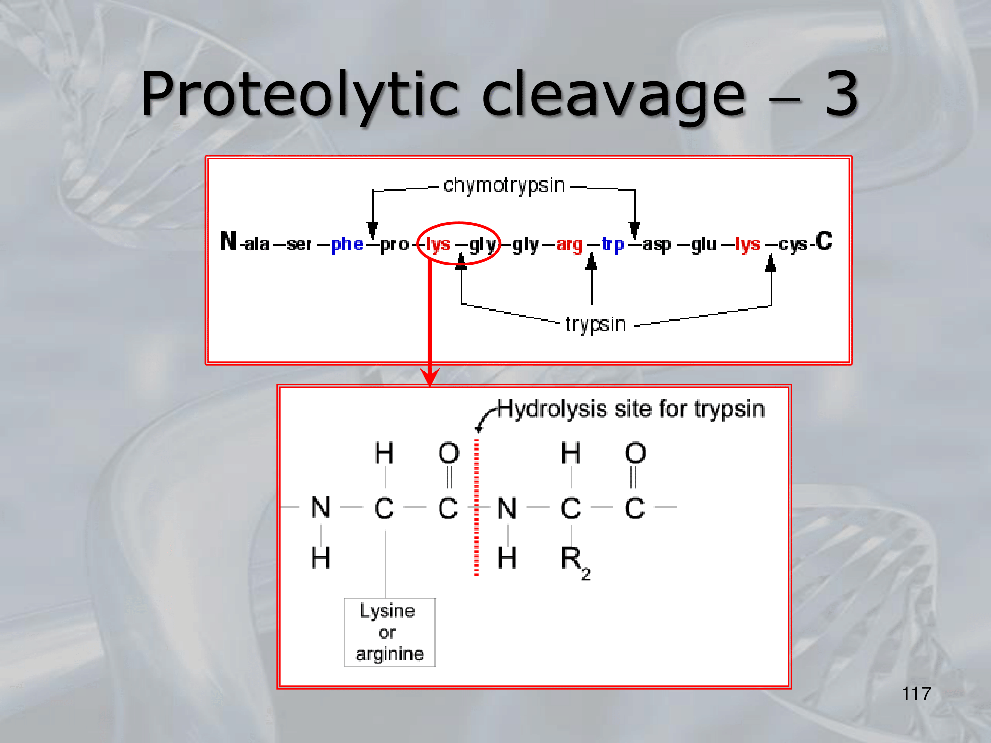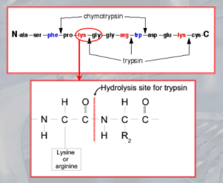 - Trypsin cuts the peptide bond on the carboxyl side of lysine and arginine residues