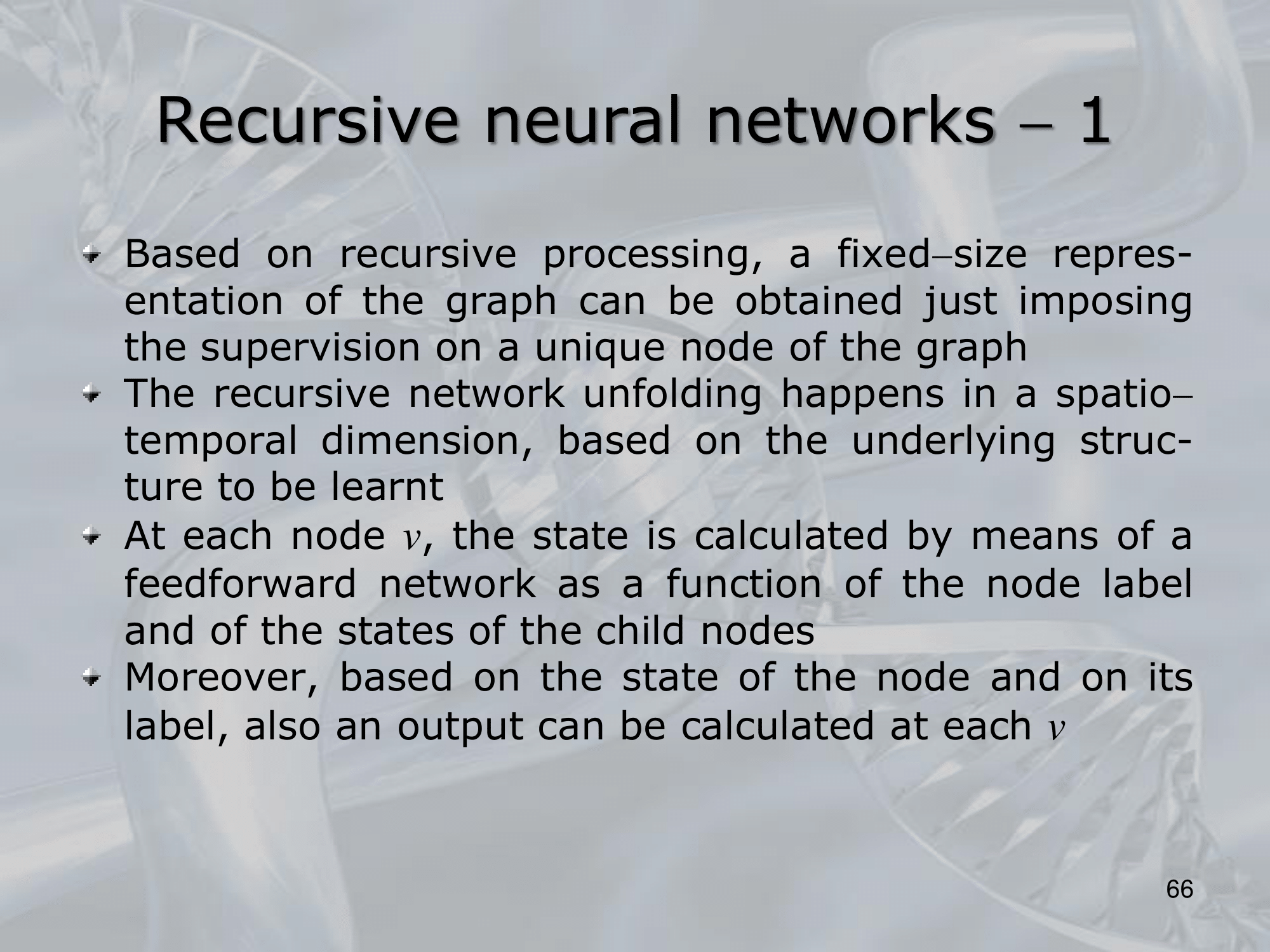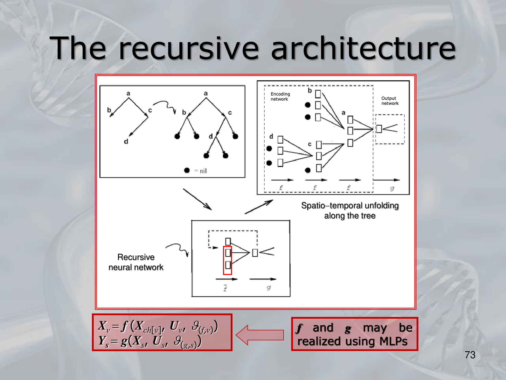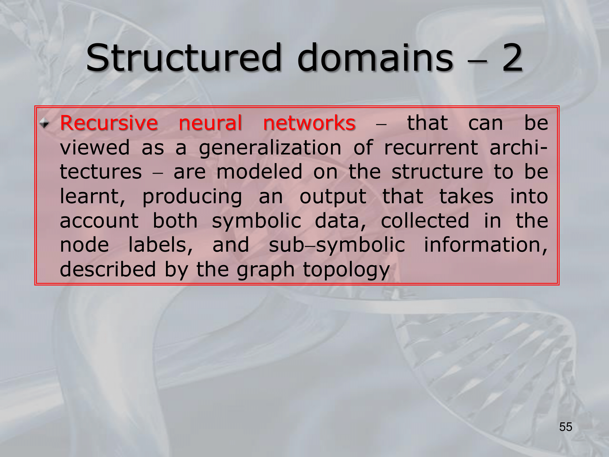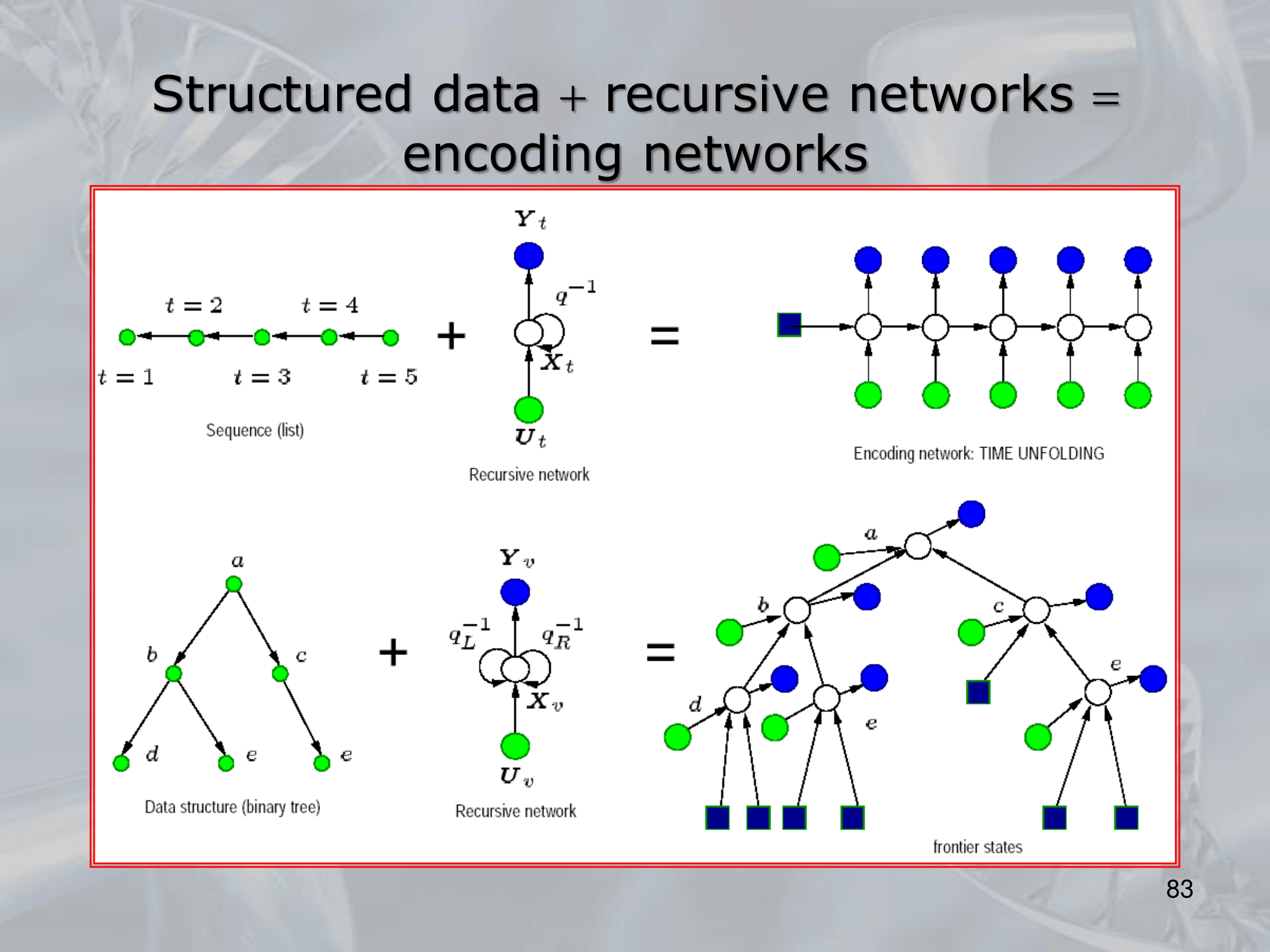 The key idea behind RNNs is to define a neural network architecture that can be applied recursively to the substructures of the input, allowing the network to build up a representation of the entire input by combining information from its substructures. This is typically done by defining a set of local transition functions that operate on each substructure, and using these functions to propagate information up the tree or graph structure.