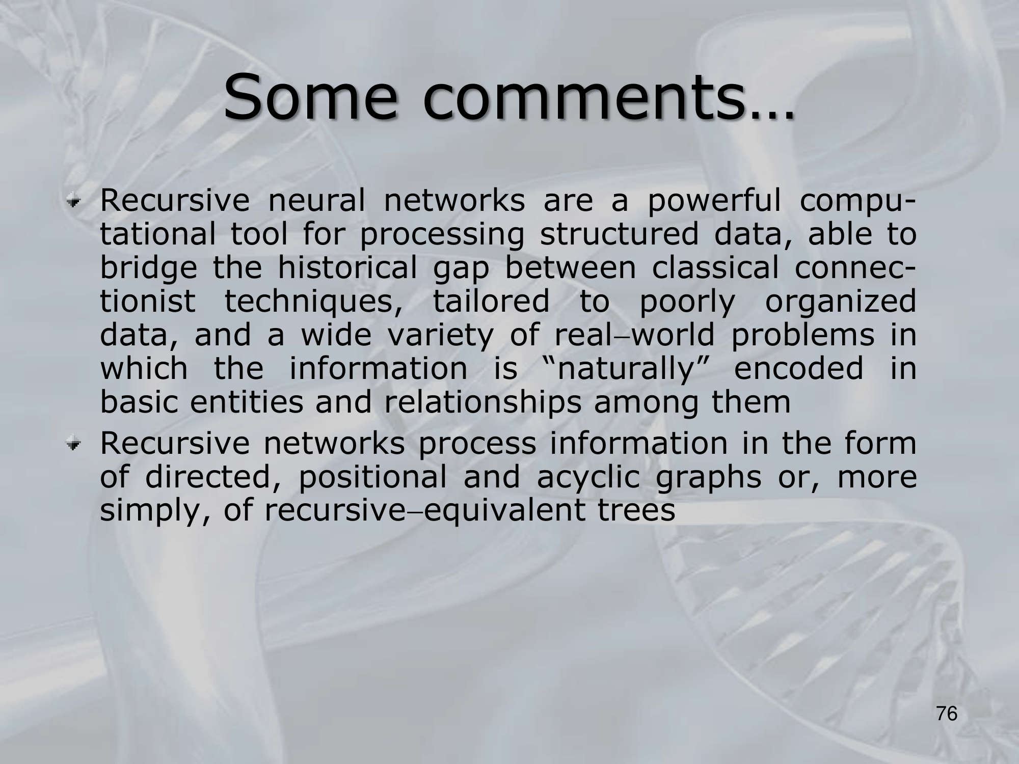 ==Recursive Neural Networks (RNNs) are a type of neural network architecture that is designed to process structured input data, such as trees or graphs, where the input can be recursively decomposed into smaller substructures==.