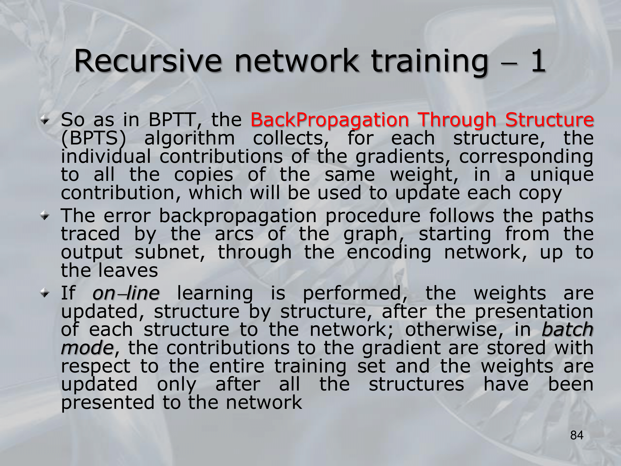 RNTN are trained using backpropagation, using a set of trained labeled structures, and a cost function that will give a higher score based on how similar the target structure and the output structure are.