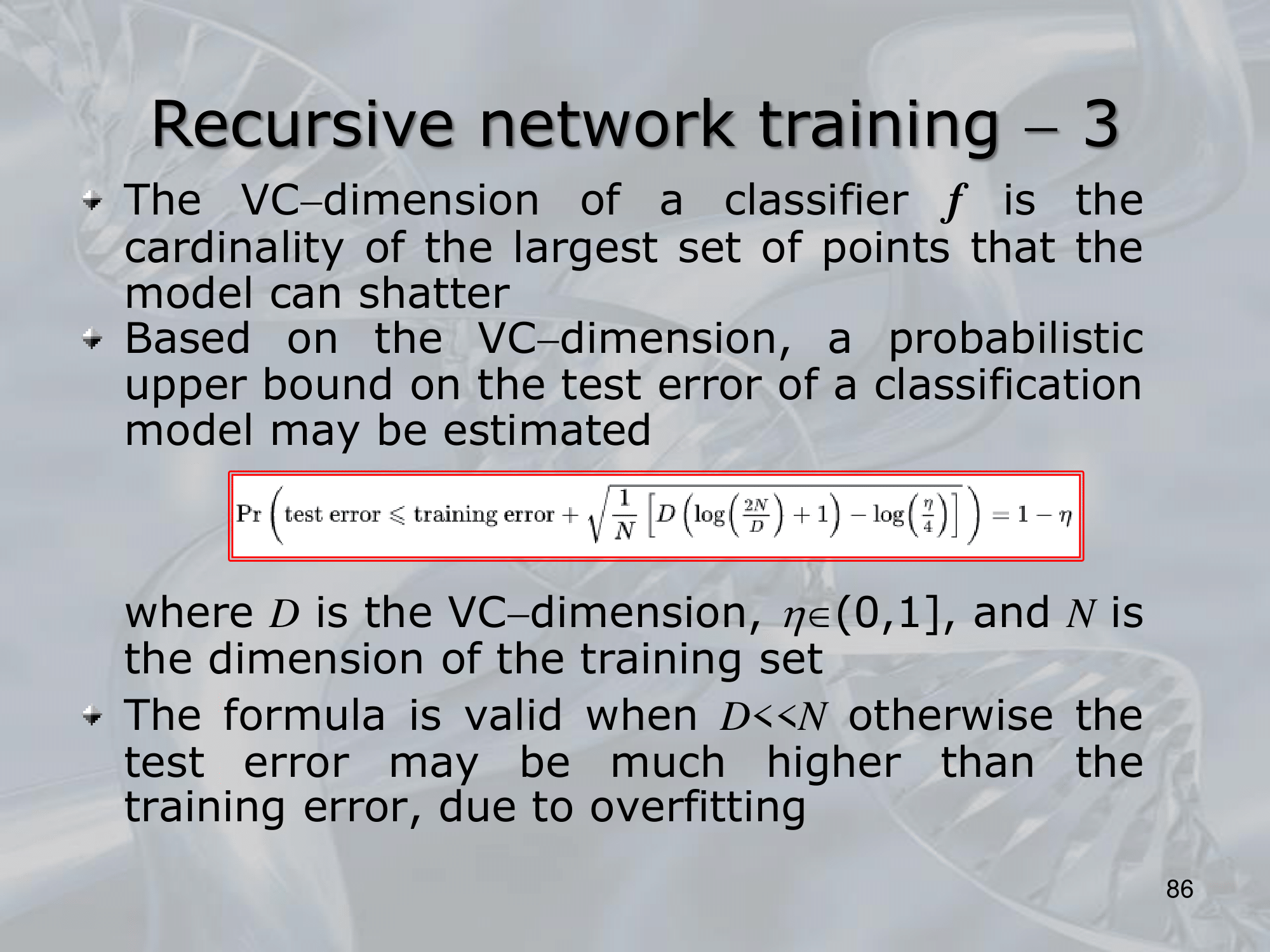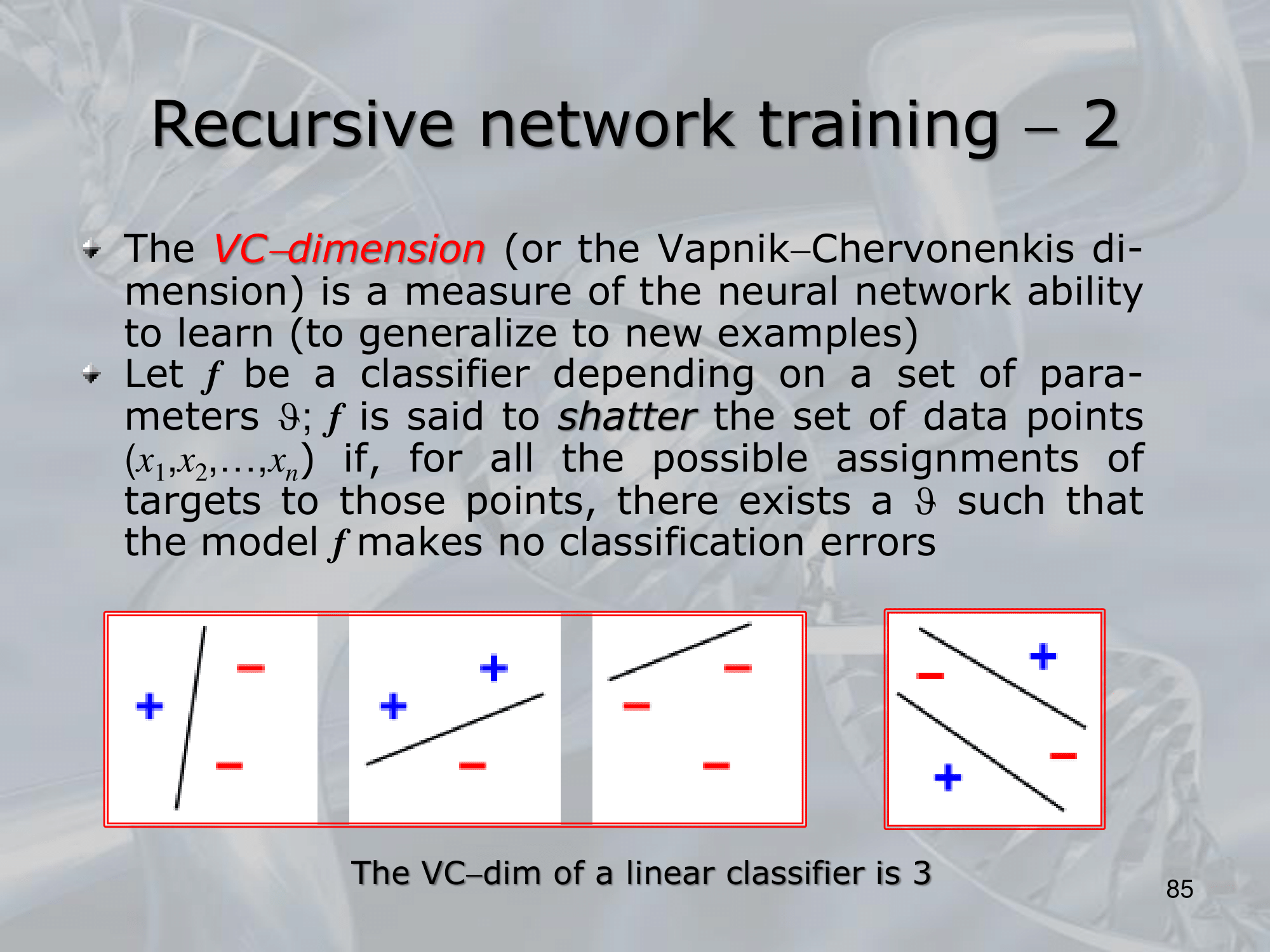In essence, the VC dimension is the maximum number of points that a model can shatter or separate in all possible ways, i.e., it can classify any dichotomy of the points without making any mistakes. More formally, the VC dimension of a binary classification model is defined as the size of the largest set of points that can be shattered by the model, where shattering means that the model can classify any possible labeling of the points as positive or negative examples.