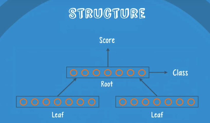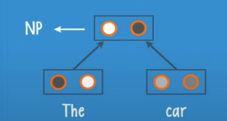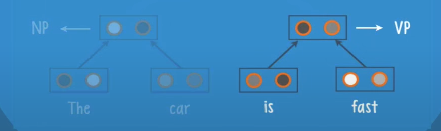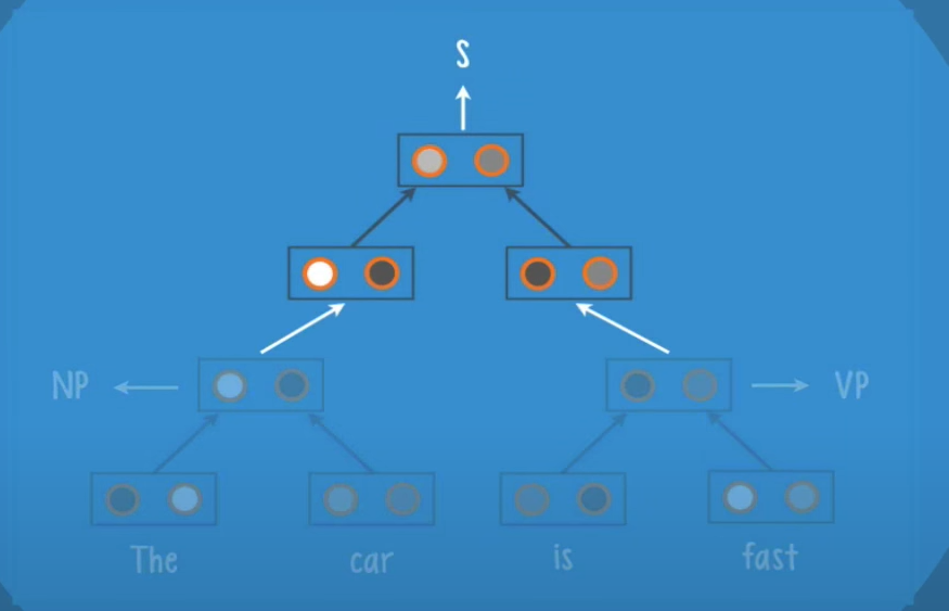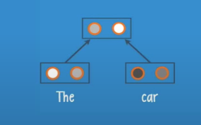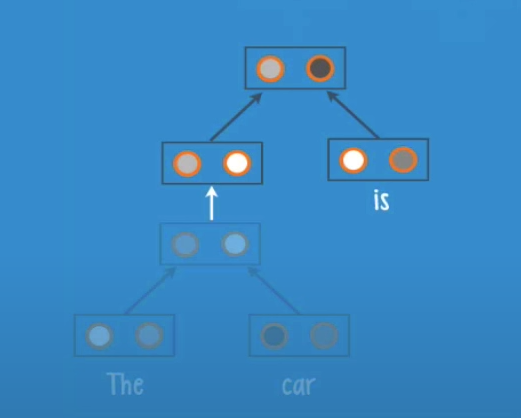 In this case we have the leaves âTheâ and âcarâ they get pass to the root, and the neurons inside the root will give us a class and a score