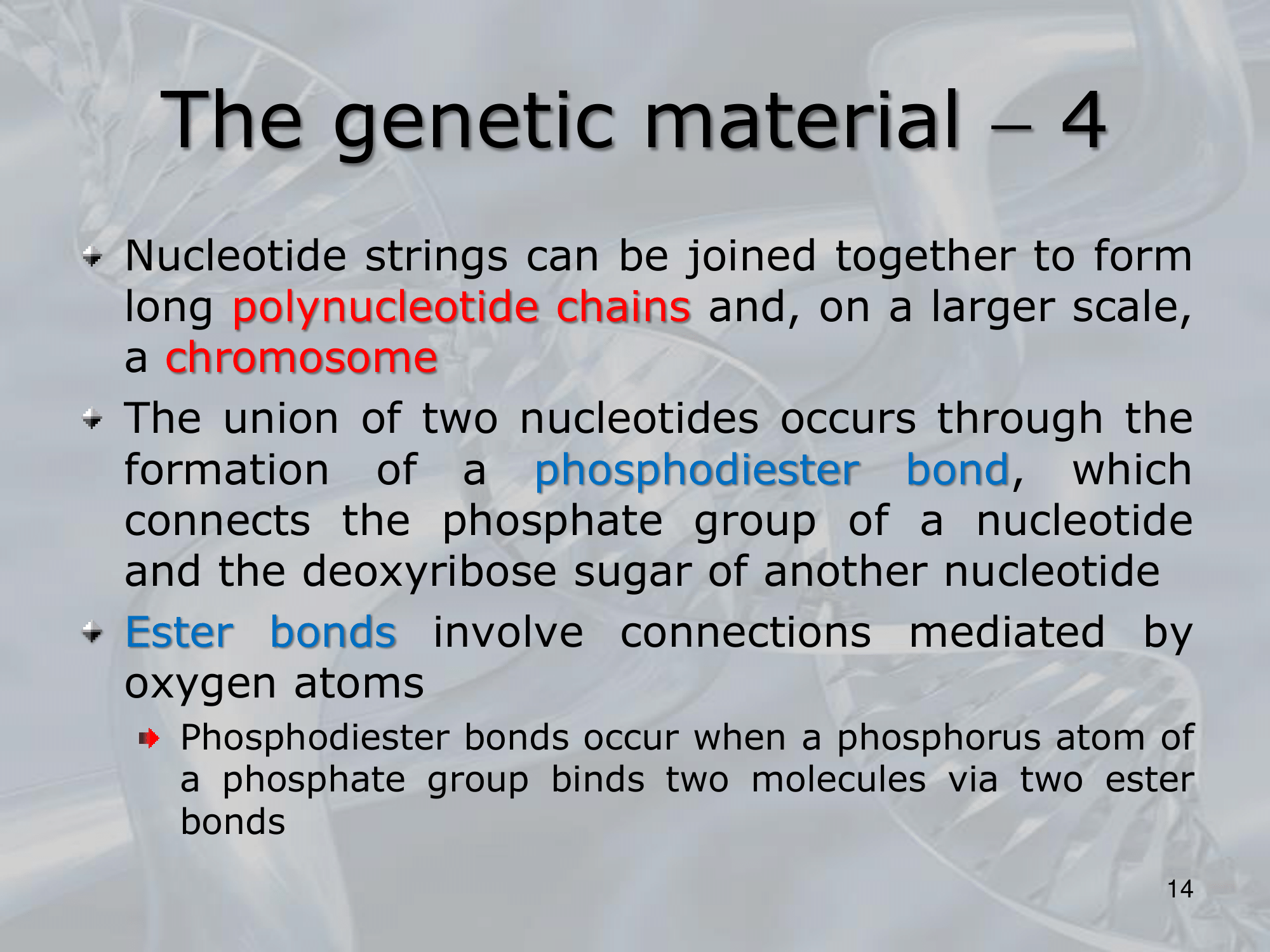 IMPORTANTE Per formare il DNA i nucleotidi si uniscono tra loro formando un legame covalente detto il legame fosfodiestere (o legame estere) tra il gruppo fosfato (), ed lo zucchero desossiribosio (), ad ogni unione di due nucleotidi una molecola d’acqua () è “persa”