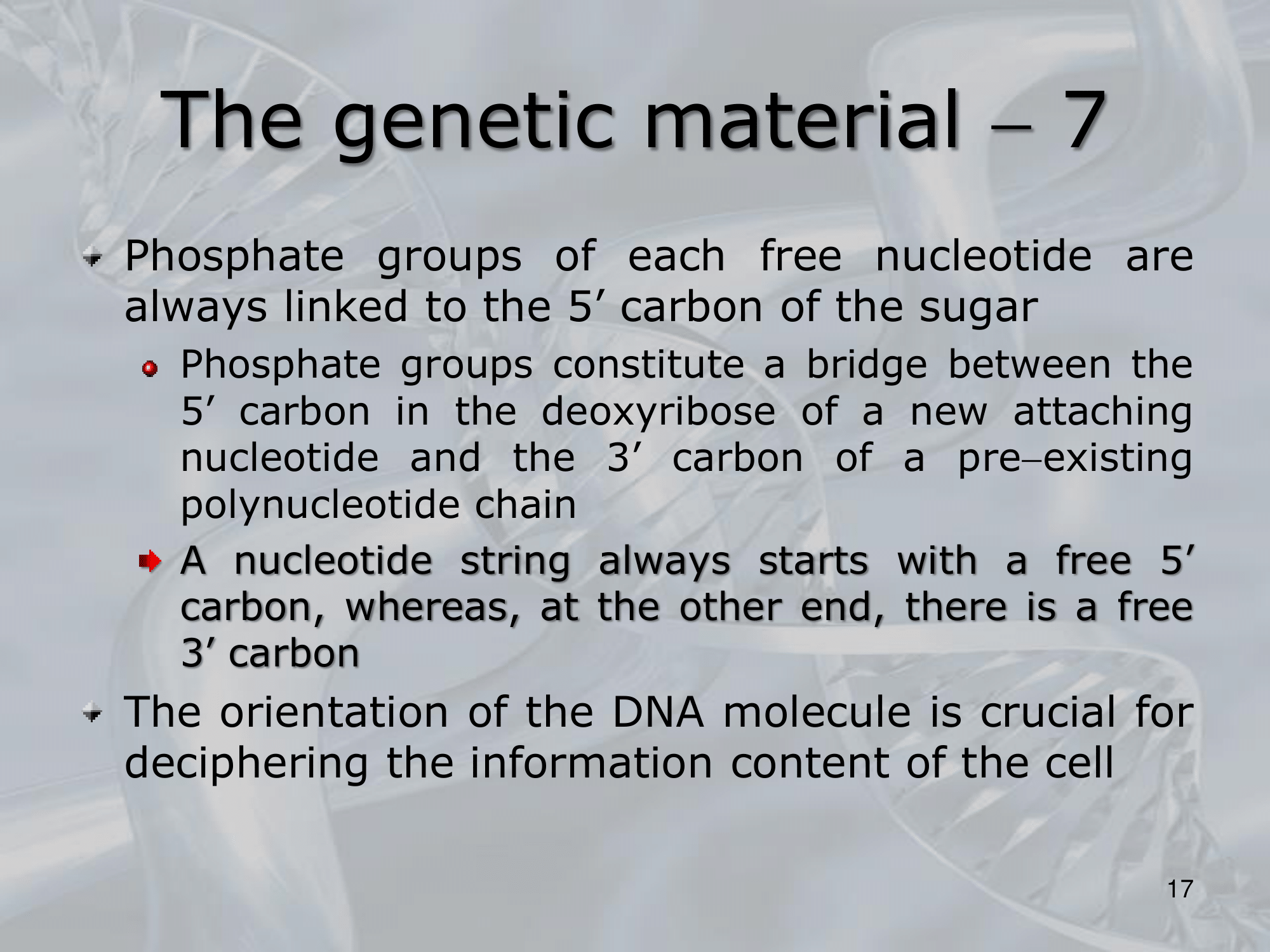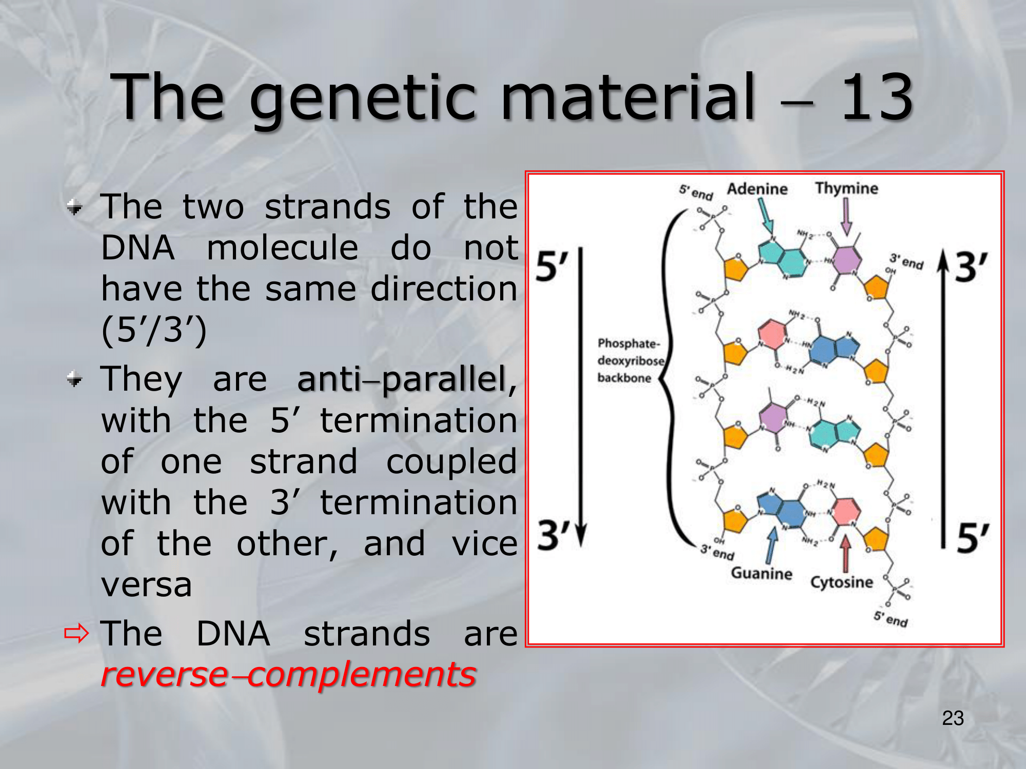 Le due stringhe di DNA si dicono inversamente complementari, infatti la prima parte con un carbonio in posizione e l’altra con un carbonio in posizione , quindi si può dire che ‘le due stringe vengono lette in due sensi anti-paralleli’.