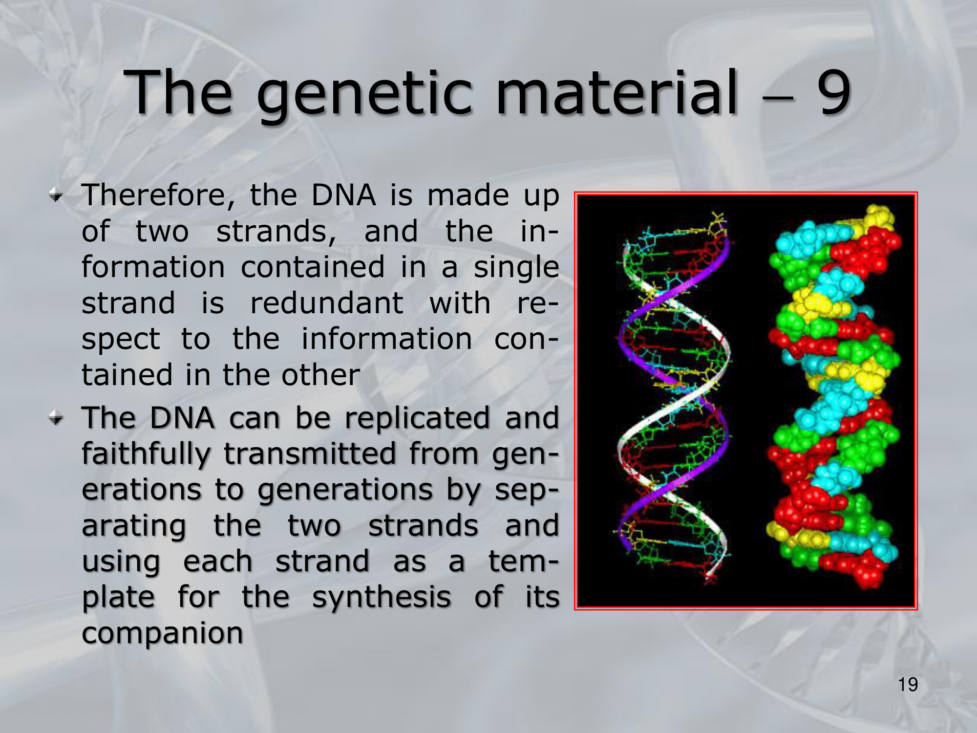 The sequence of the nitrogenous bases along the DNA molecule carries genetic information that encodes the instructions for the development, function, and reproduction of all living organisms. - In addition to its role in encoding genetic information, DNA also plays a critical role in the transmission of genetic information from one generation to the next through the process of DNA replication, where the two strands of the DNA helix separate and each strand serves as a template for the synthesis of a new complementary strand.