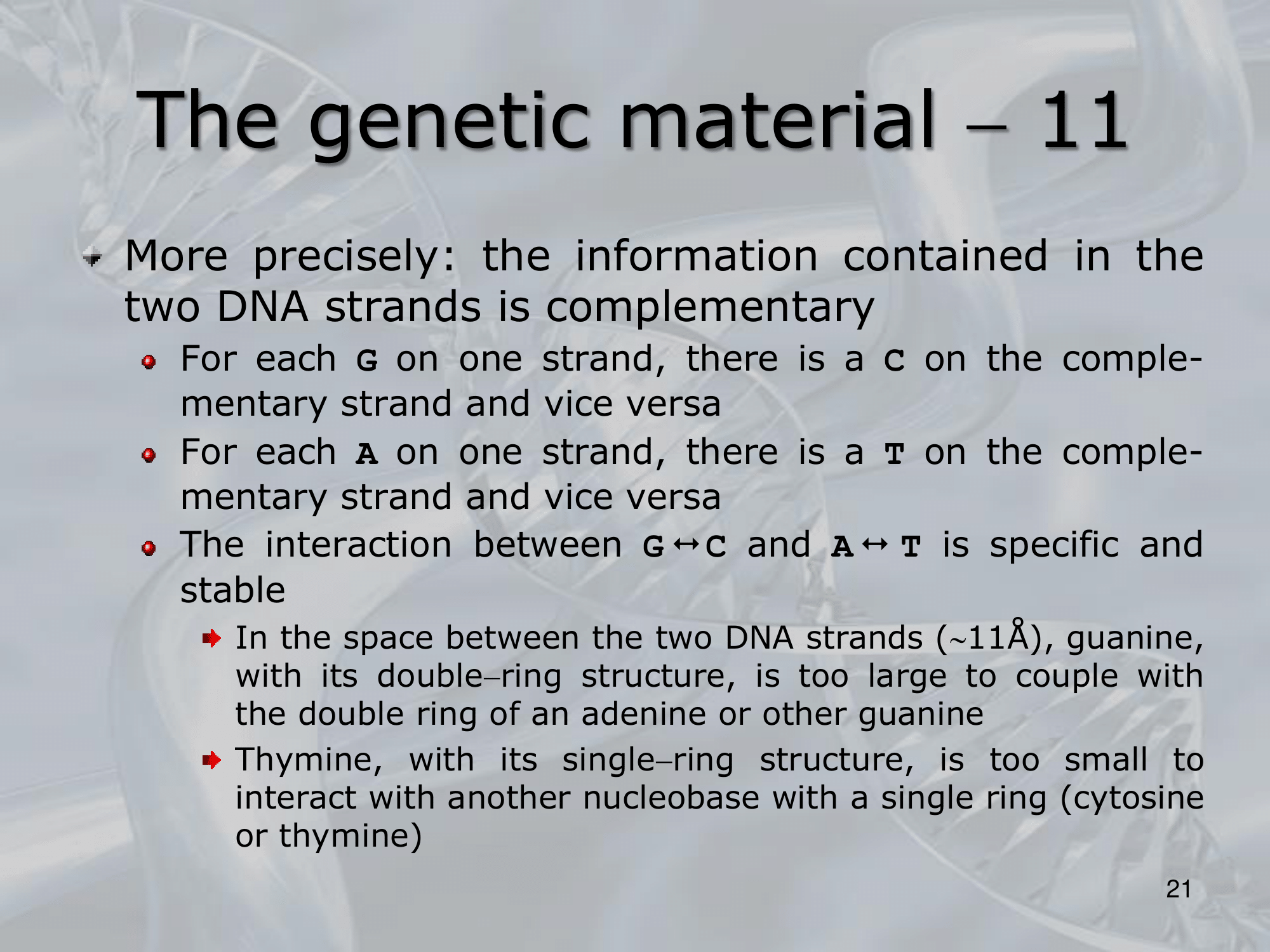 IMPORTANTE Le basi o nucleobasi che compongono il DNA sono: G, A, T, C (Guanina, Adenina, Timina, Citosina) Sono divise in due gruppi: Purine (G, A) e Pirimidine (T, C). Le coppie di basi sono GC e AT; il DNA è composto da una doppia elica, dove l’informazione è ridondante nelle due, se in un’elica troviamo la base A, nell’altra troveremo una T e viceversa, se inveve in una troviamo una G, nell’altra troveremo una C, e viceversa.