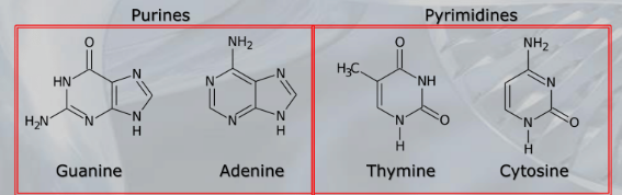 Adenine and guanine are purines, which are larger double-ringed molecules, while cytosine and thymine are pyrimidines, which are smaller single-ringed molecules.