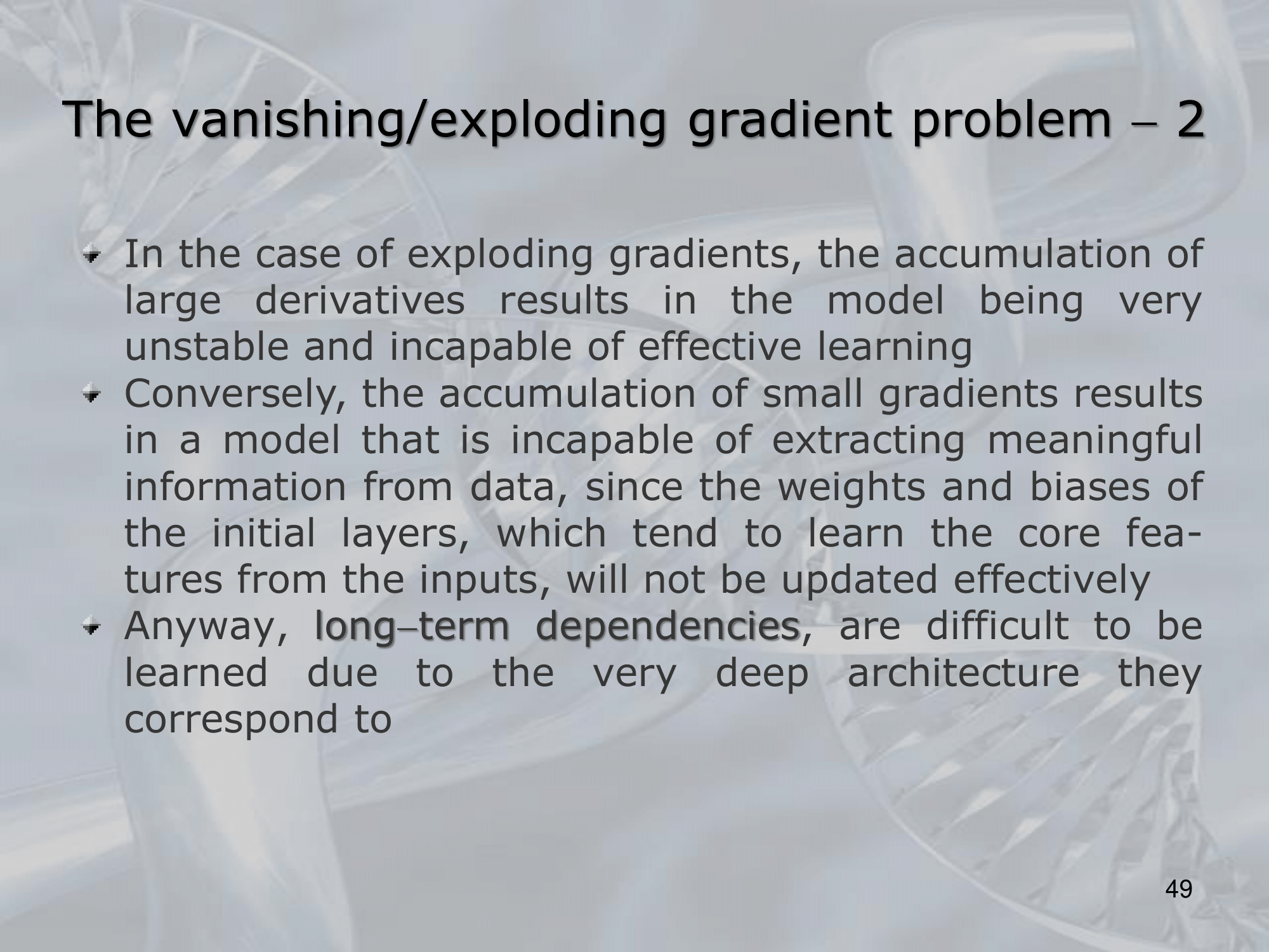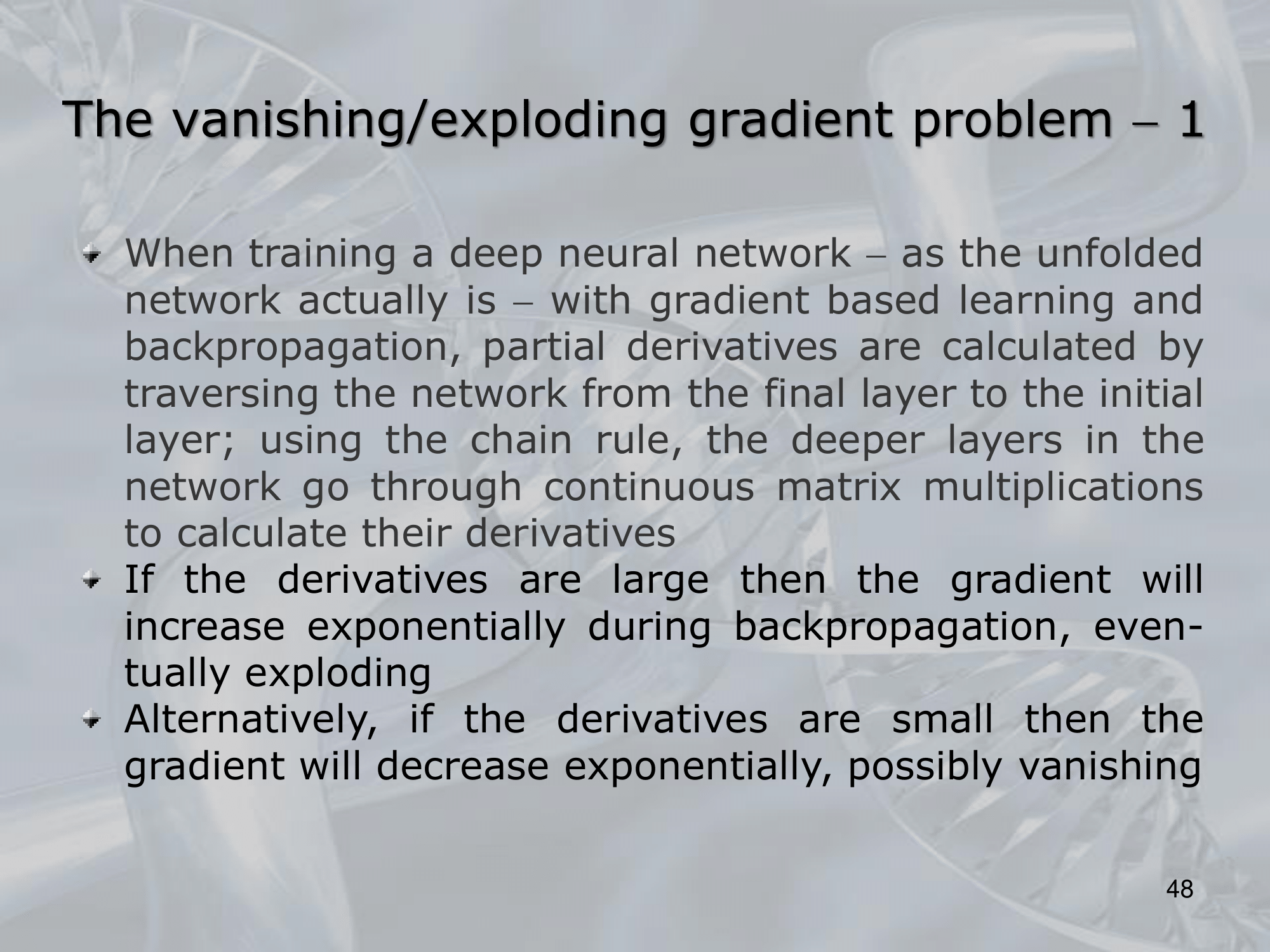==The vanishing/exploding gradient problem is particularly pronounced in deep networks with many layers, as the gradients must be propagated through multiple layers before reaching the input layer==. In such networks, the gradient can be subject to repeated multiplication or division by the same weight matrix, leading to the exponential amplification or attenuation of the gradient.