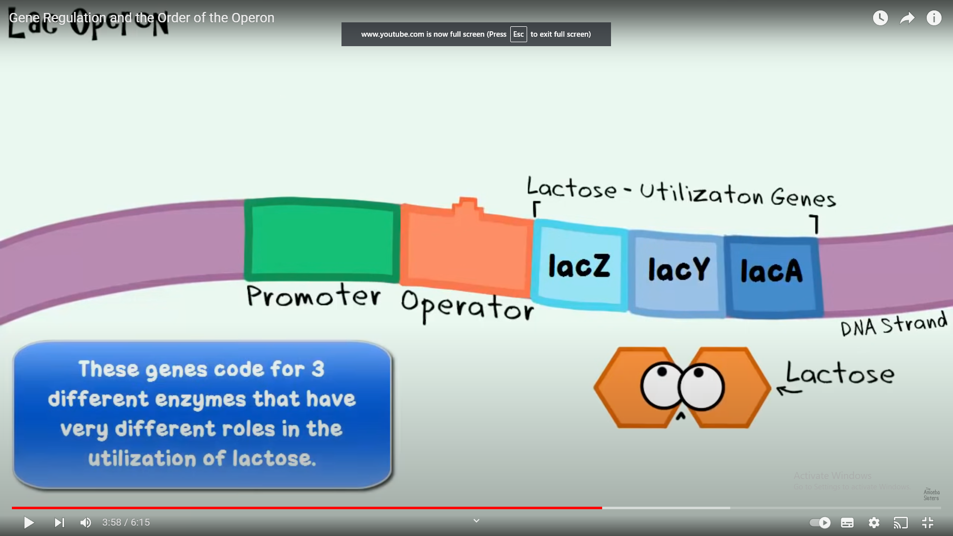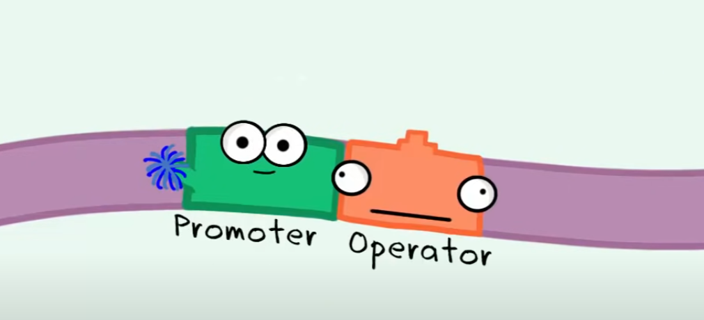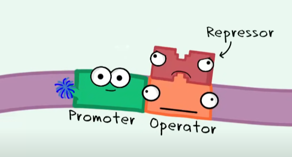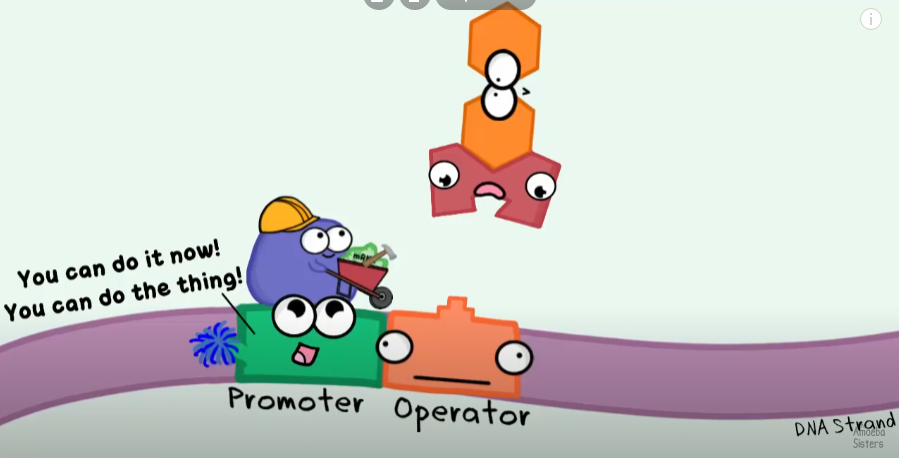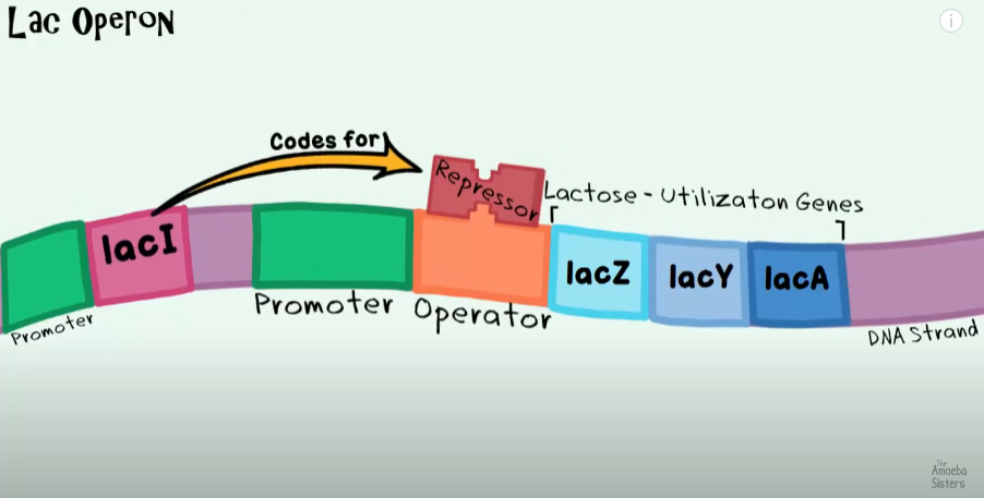 QUINDI: Only in the presence of lactose (sugar) the repressor is disables, and the RNA Polymerase can start trascribing the enzymes’ genes to help breake down lactose