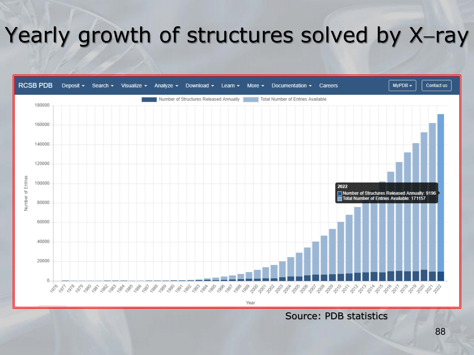 In detail from the X-ray diffreaction spectrum of the crystal, we are able to calculate the electron density map, which is in practice an upscaled image of the molecules from the crystal (upscaled ) Then a computer we verify the 3D structure agreement (fitting) with a molecular model. The error is between ~ (really good) The final structure is the avarage of multiple crystallographies of copies of a single protein, the protein are not compleatelly rigid, and we need to eliminate the background noise produced by the water molecule in each crystal, so this step is necessary. Crystallography is still the main way to get 3D protein Structures, as of now proteins have been analyzed by x-ray crystallography.