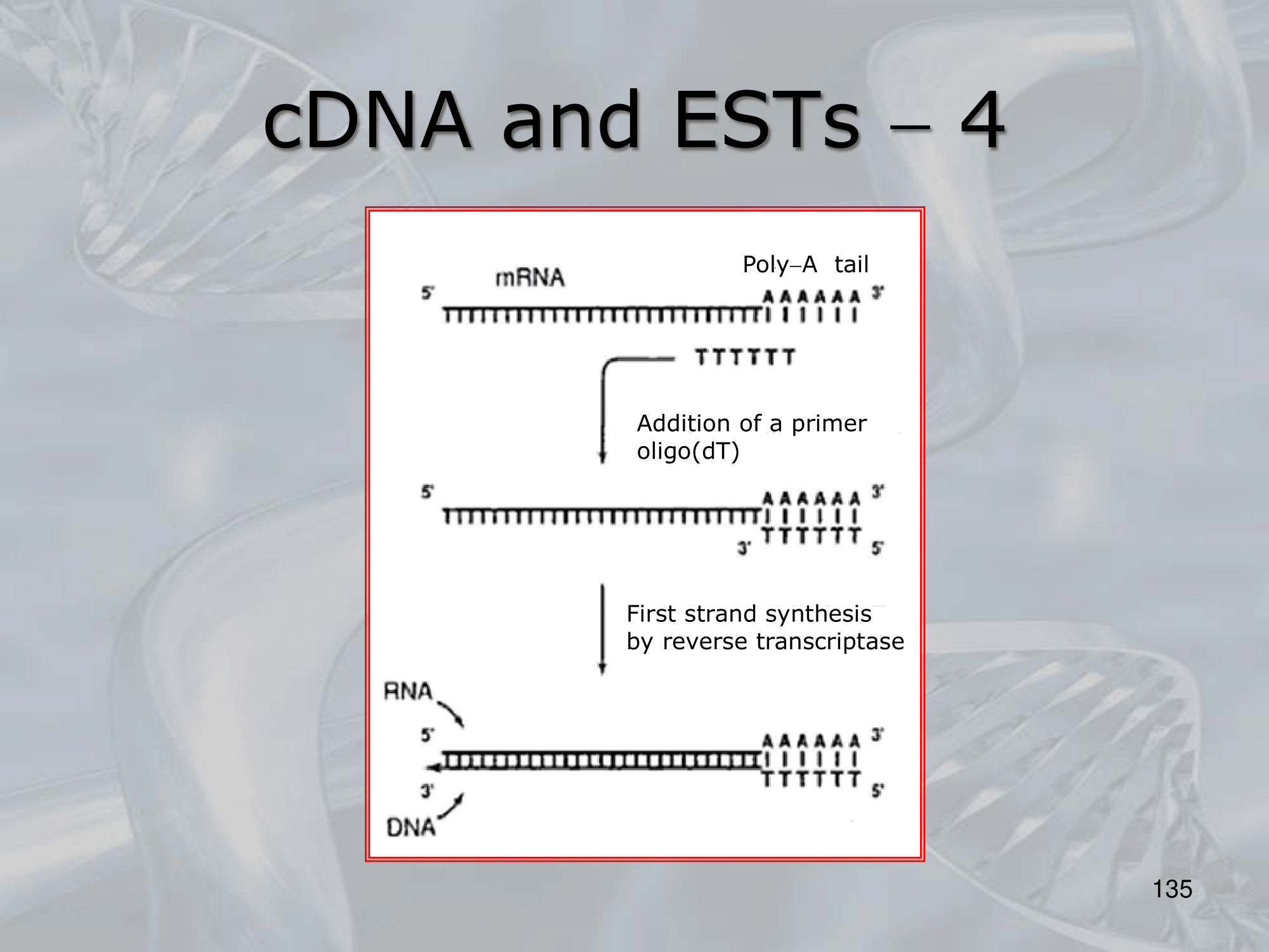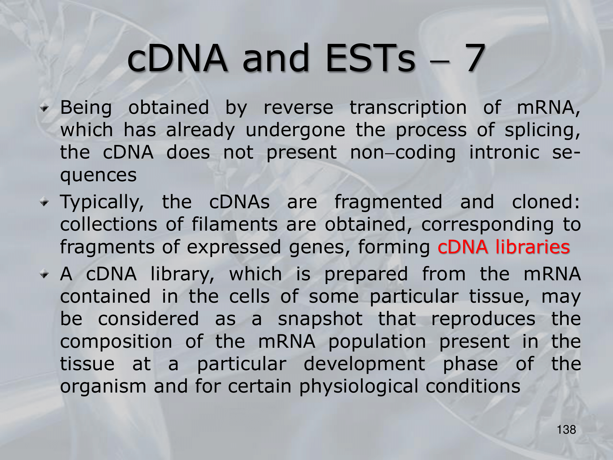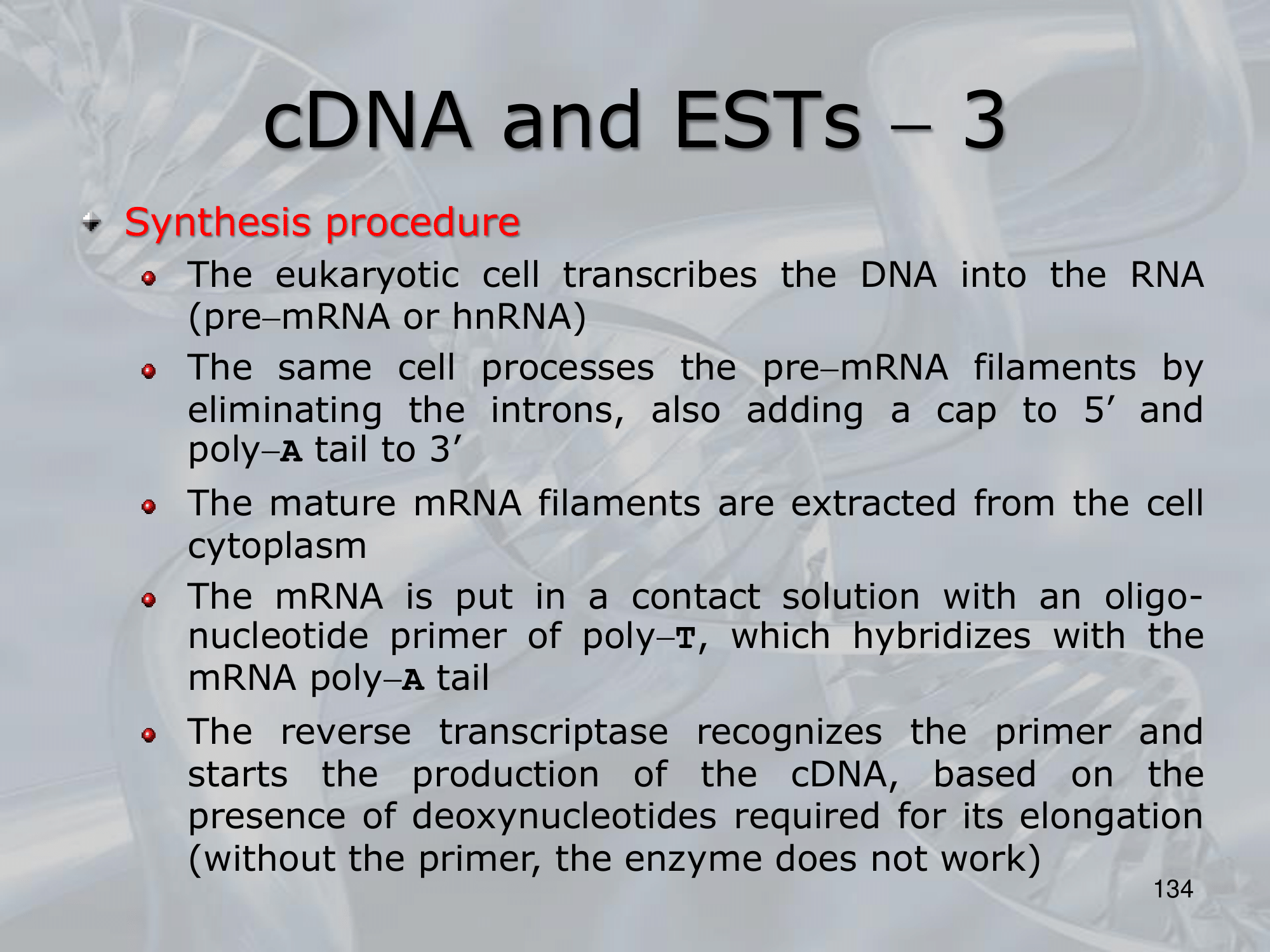 ESTs are important tools in molecular biology and genetics research because they can be used to identify and analyze genes that are actively transcribed and expressed in a particular tissue or cell type. - The process of generating ESTs typically involves the construction of a cDNA library from mRNA molecules that have been extracted from a particular tissue or cell type.