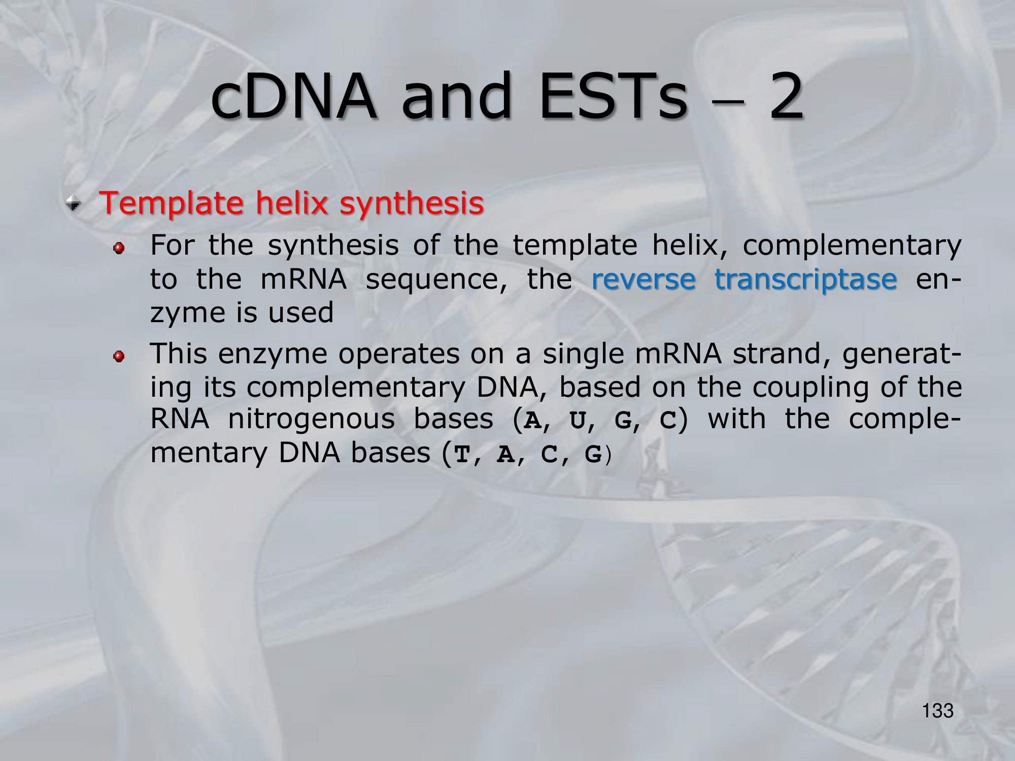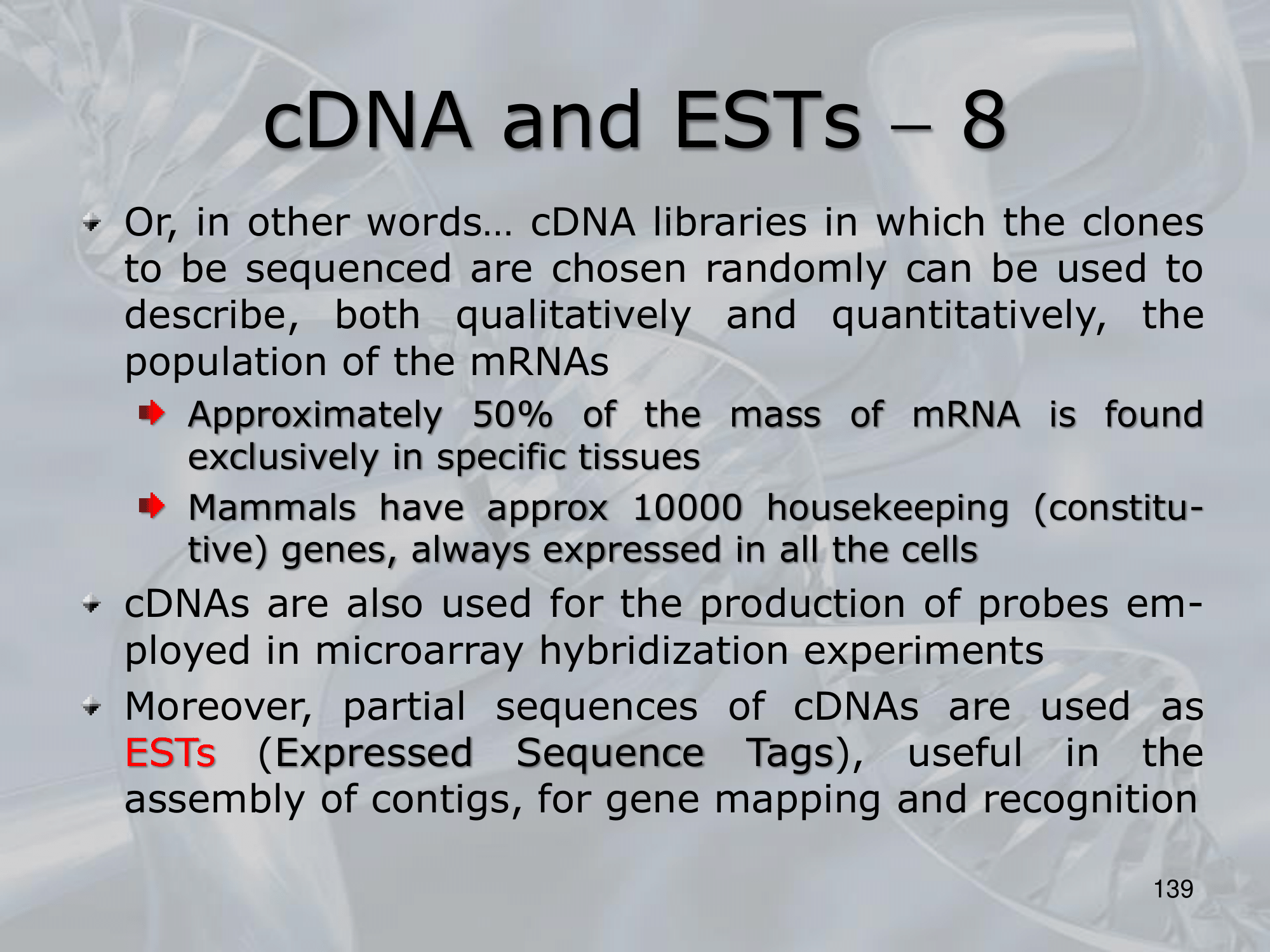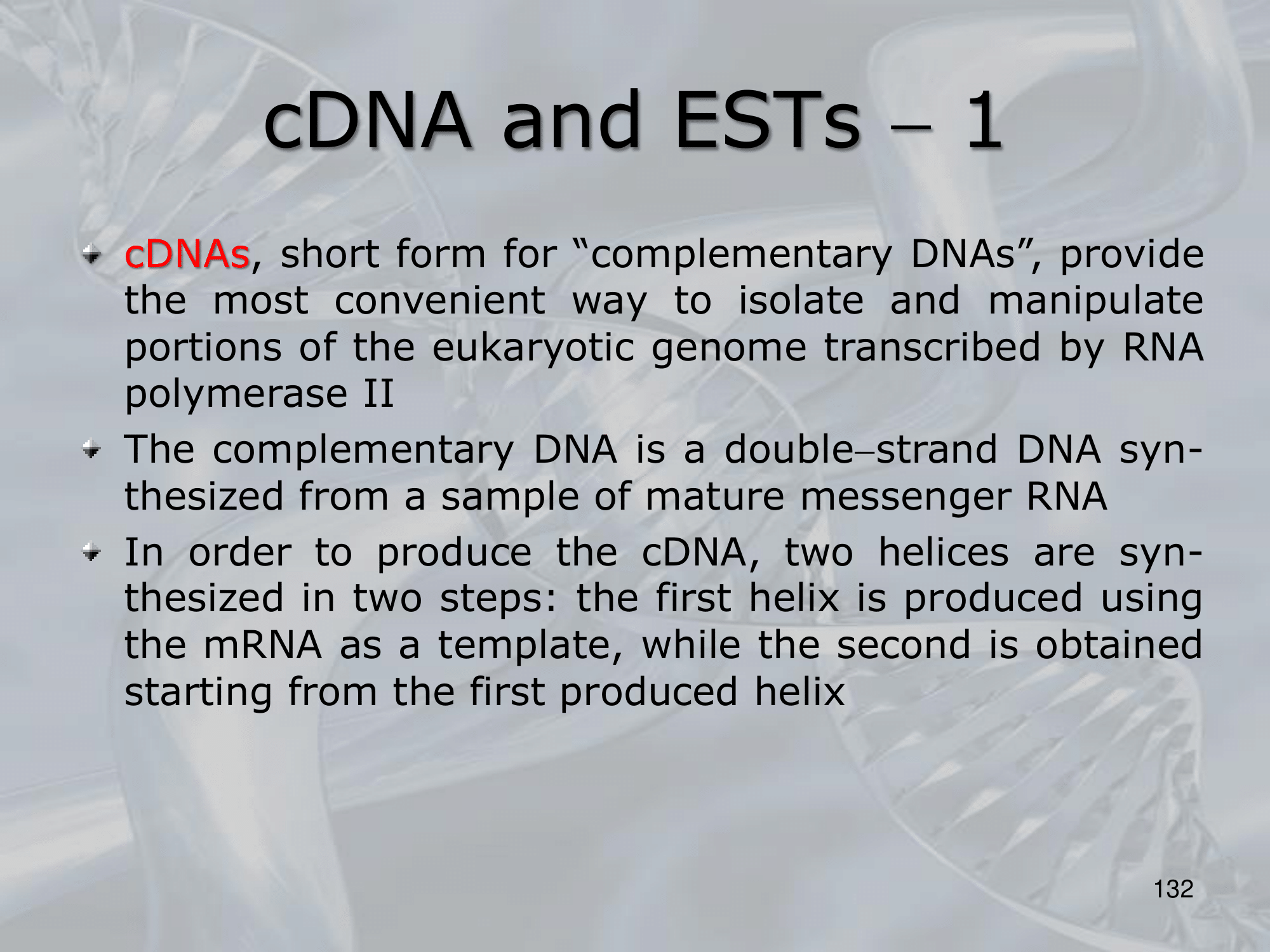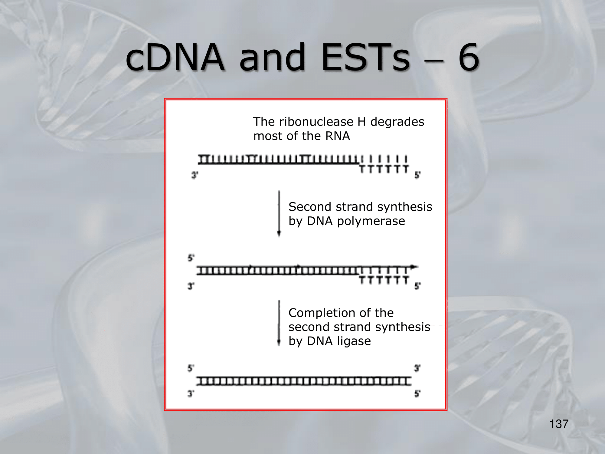 ESTs are important tools in molecular biology and genetics research because they can be used to identify and analyze genes that are actively transcribed and expressed in a particular tissue or cell type. - The process of generating ESTs typically involves the construction of a cDNA library from mRNA molecules that have been extracted from a particular tissue or cell type.