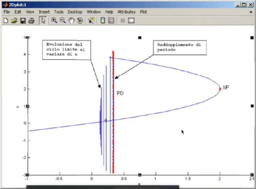 Now, if we increase again the limit cycle will then distabilize and go through a period doubling bifurcation: