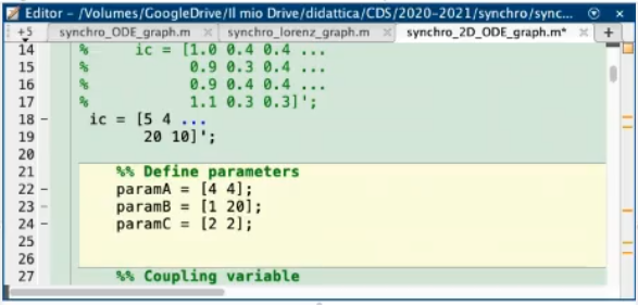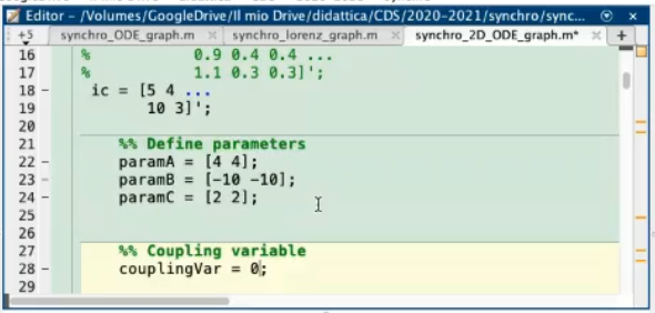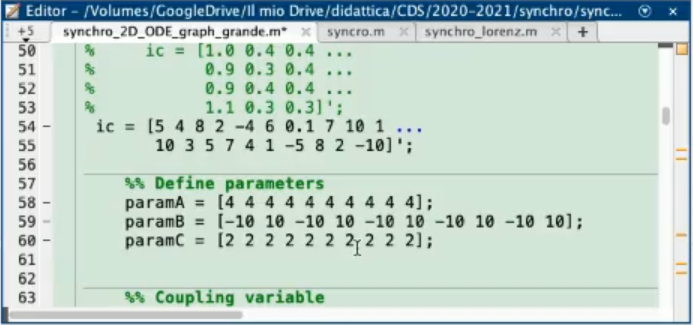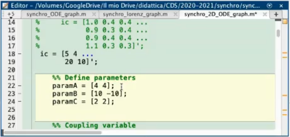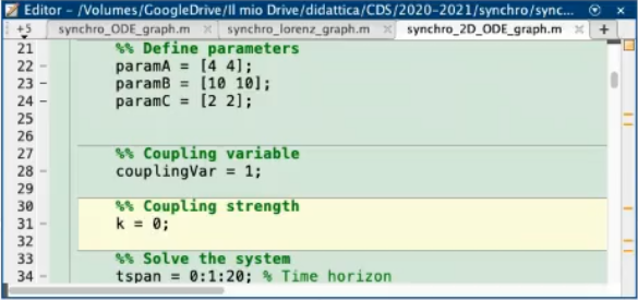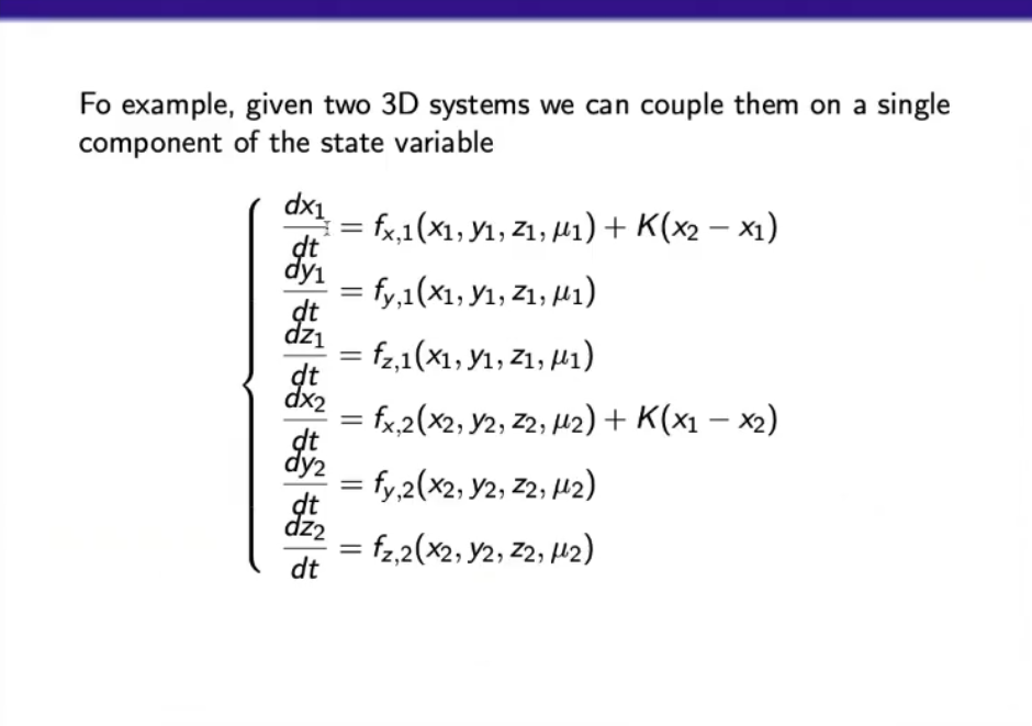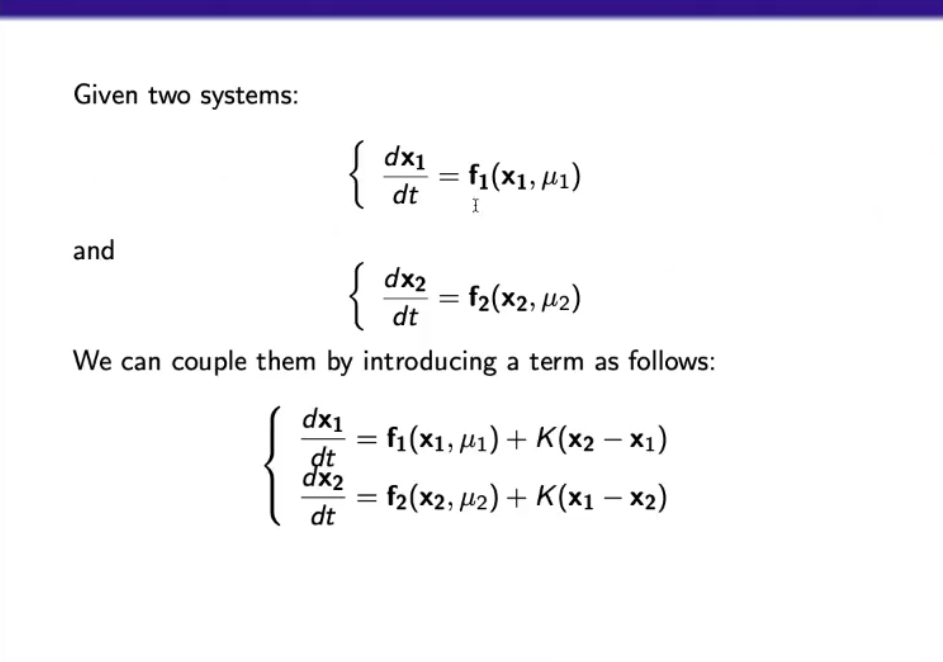 - Leaving the first equaiton untuched (since it serves only to define x¨ in terms of ODE equations), we can add a term called “coupling parameter” that depends on a variable of the second system.