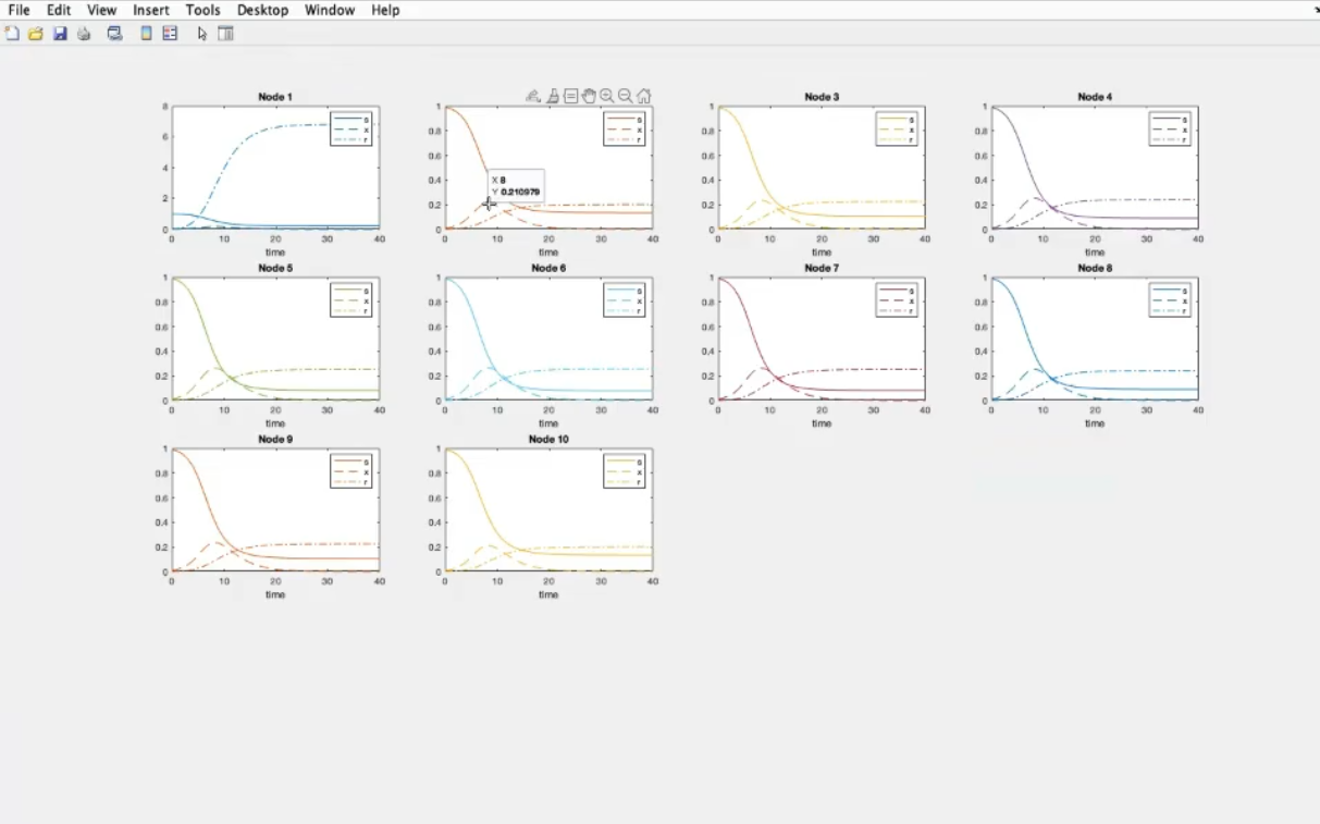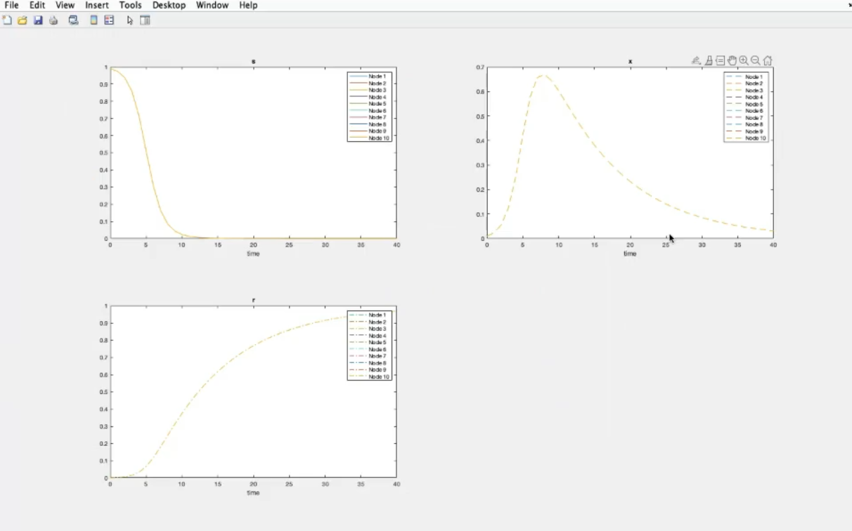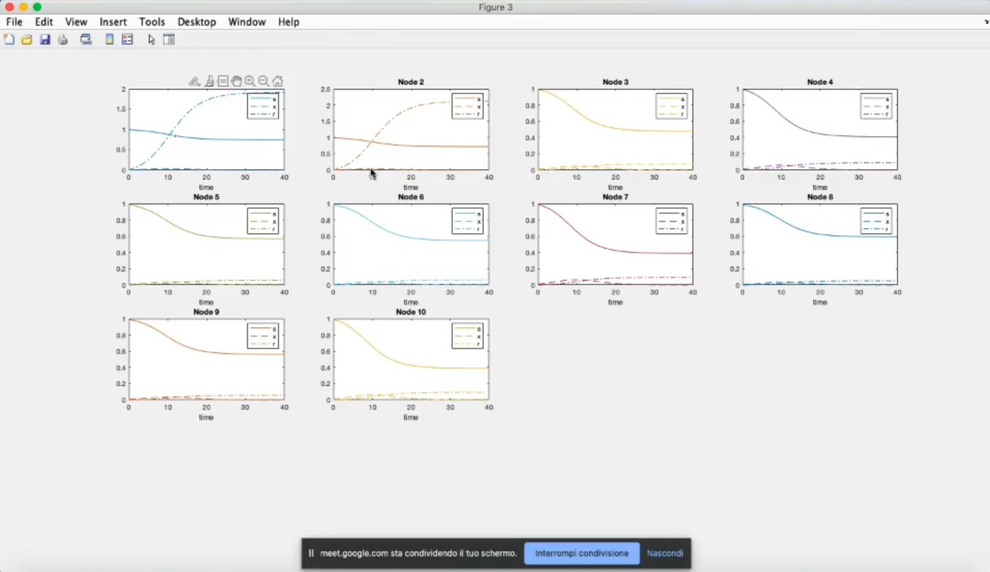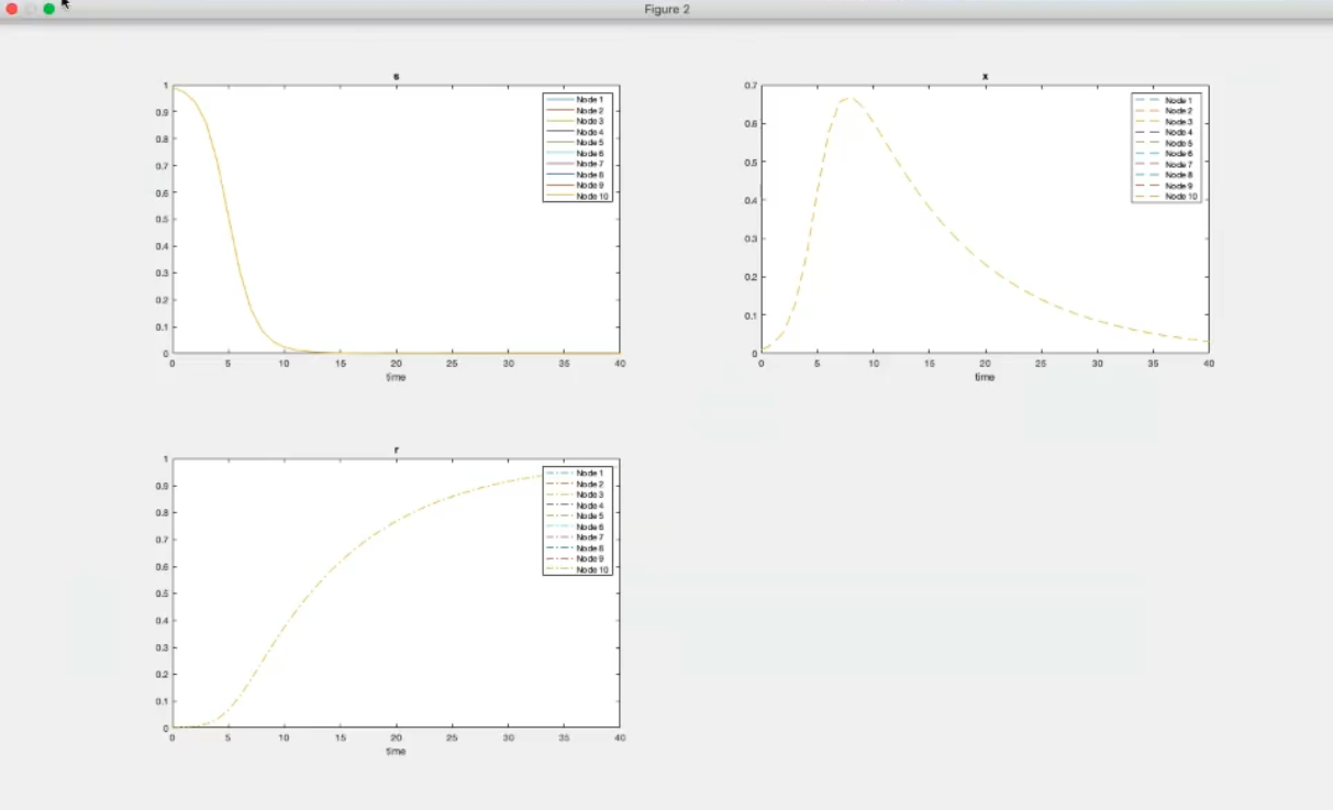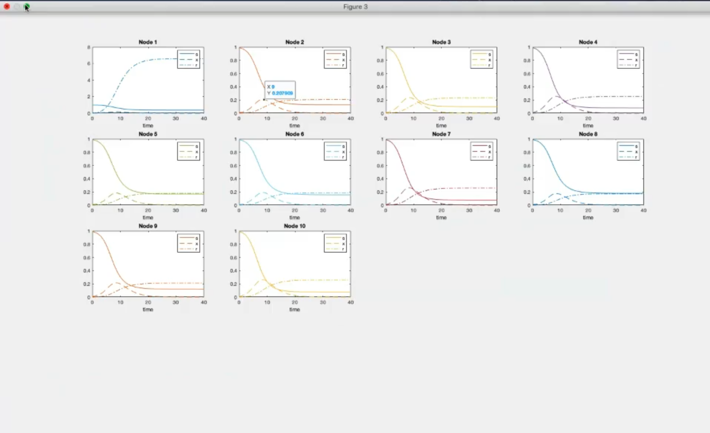 - Due to the coupling term (k=10) the other nodes have a decrease in infected people.