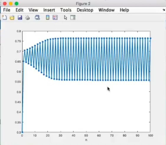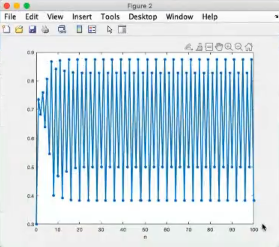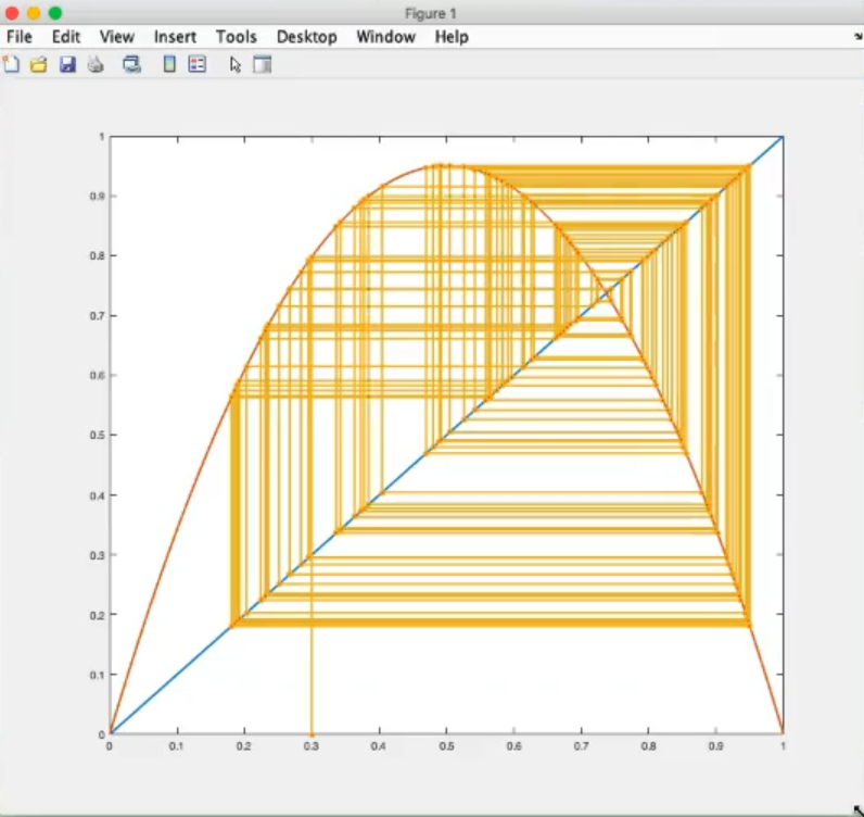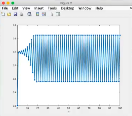 logistic_cobweb(r=3.5, x0=0.3, n=100)- The trajectory now oscillates beetween points, instead before we could say that it oscillated between points.
