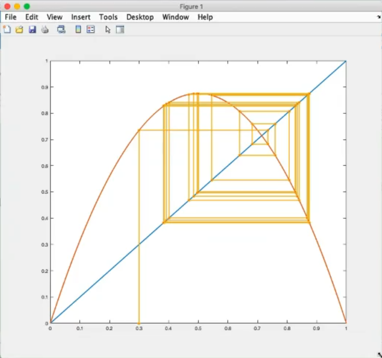 logistic_cobweb(r, x0, n), where:r: parameter .x0: initial conditions.n: number of iterations/steps.