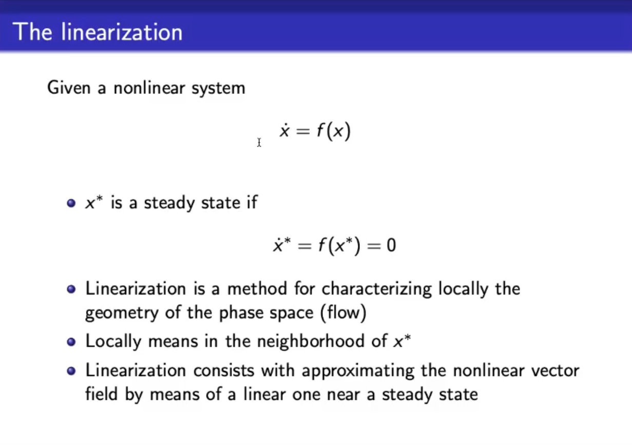 The linearization is a method for characterizing locally the geometry of the phase space (flow), locally meaning in the neighborhood of .