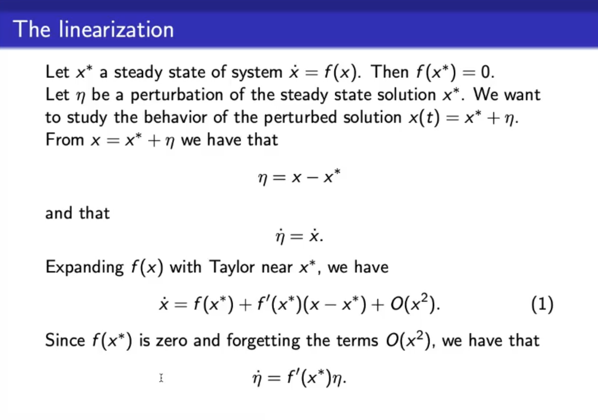 - Finally we have that , then if we study this “linearized system”, and we see that grows, meaning for , then we have that the original system will diverge from the steady state , meaning that is an unstable steady state.