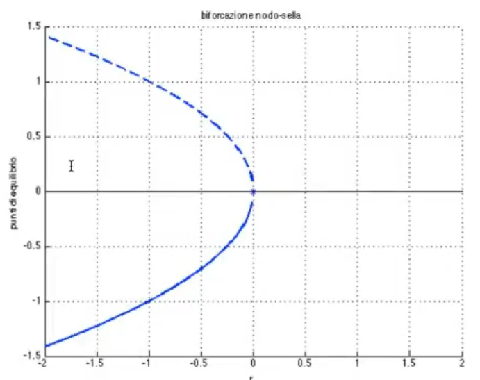 - For we have a bifurcation, and specifically this is a “saddle-node bifurcation”, since we have 1 stable and 1 unstable steady states that collpase.