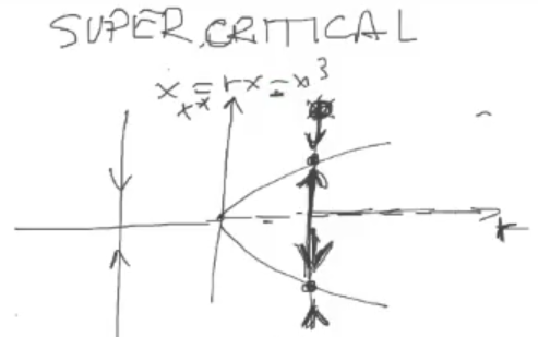 If we analyze the supercritical pitchfork bifurcation, with respect to the subcritical pitchfork bifurcation, we can see that, for the SUPERcritical case, the system is a lot more unstable, since for the supercrictical case, the system will never diverge: