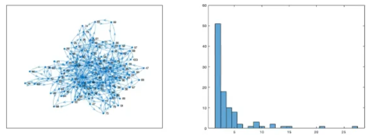 • Scale-Free graph with 100 nodes and degree 4, with histogram represengin the degree distribution: